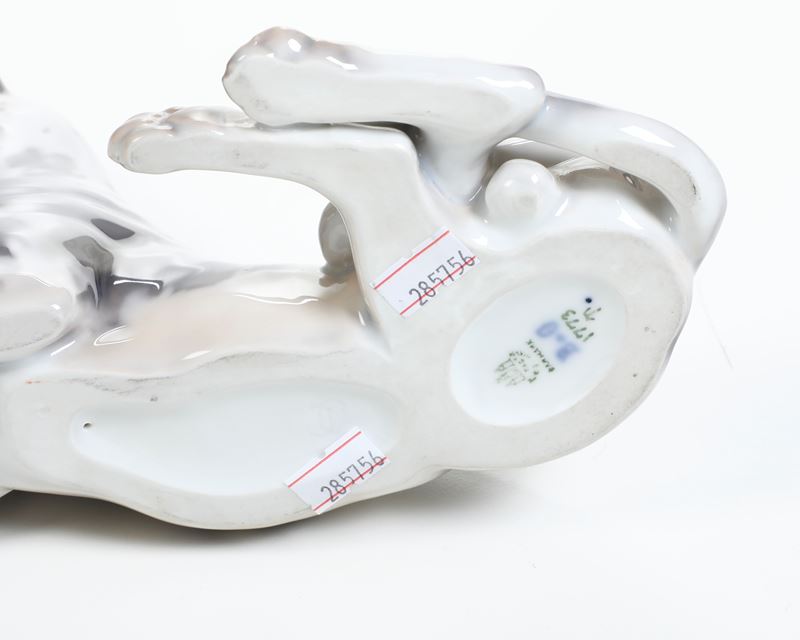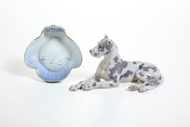 Al lotto si aggiunge un vassoietto a forma di conchiglia decorata a gabbiano (Bing & Grondhal; cm 17x17) ; un figurina di cane alano (Bing & Grondhal; lunghezza cm 30; un orecchio mancante)