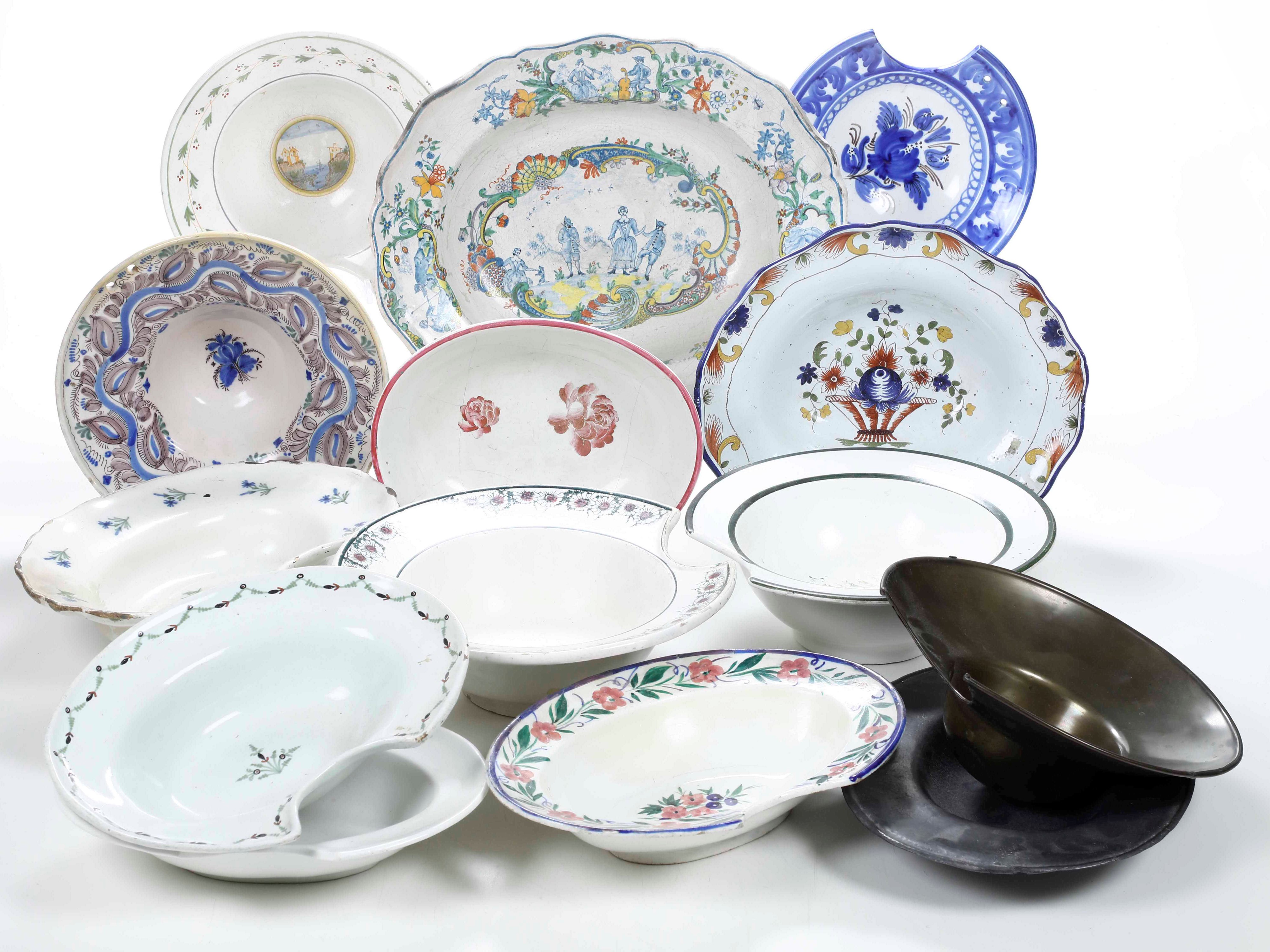 Collezione di bacili da barba in ceramica e metallo, XIX e XX secolo.
