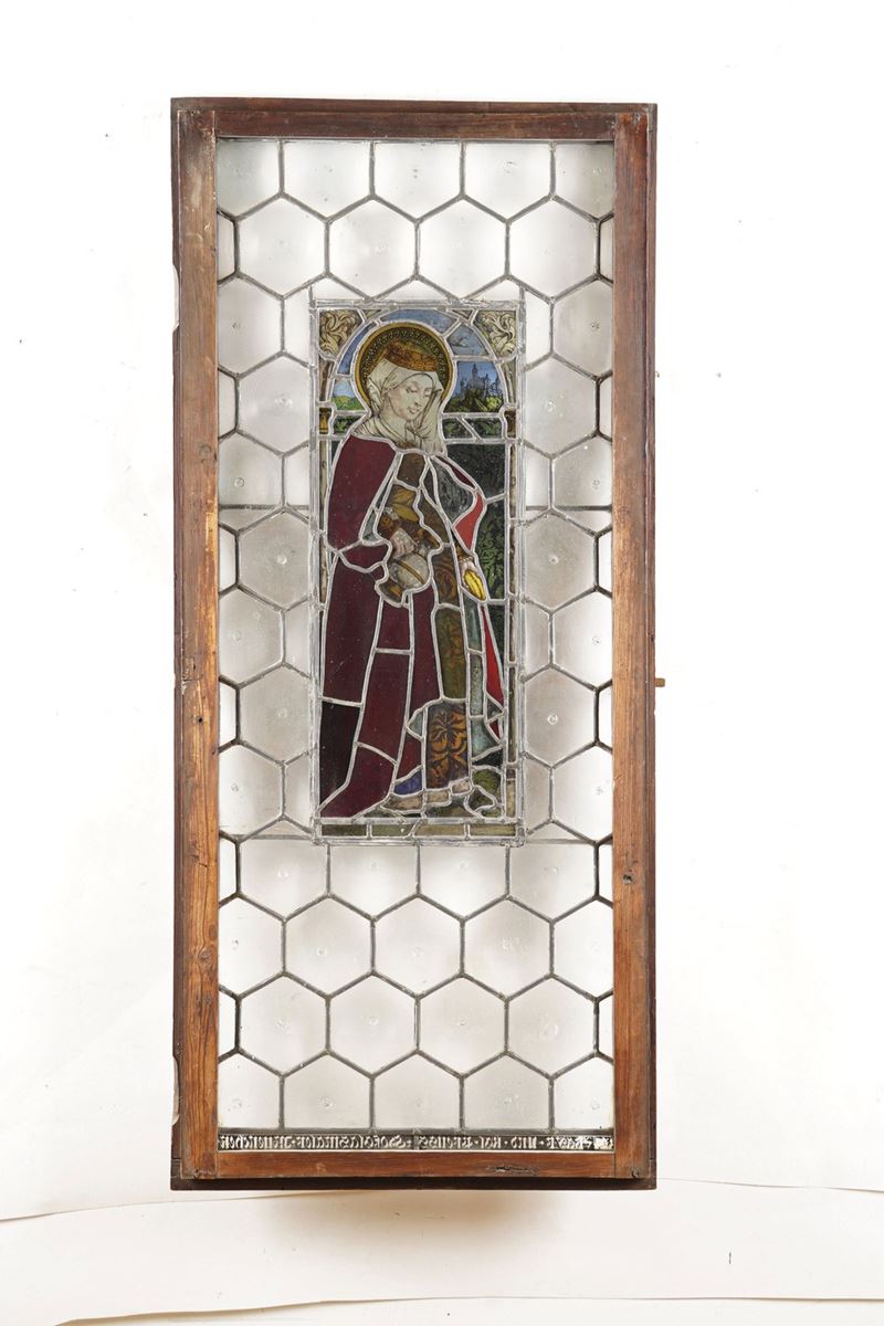 Coppia di ante con vetri piombati centrati da pannelli policromi con San Giorgio e Santa. Arte del Nord Europa, XIX secol [..]