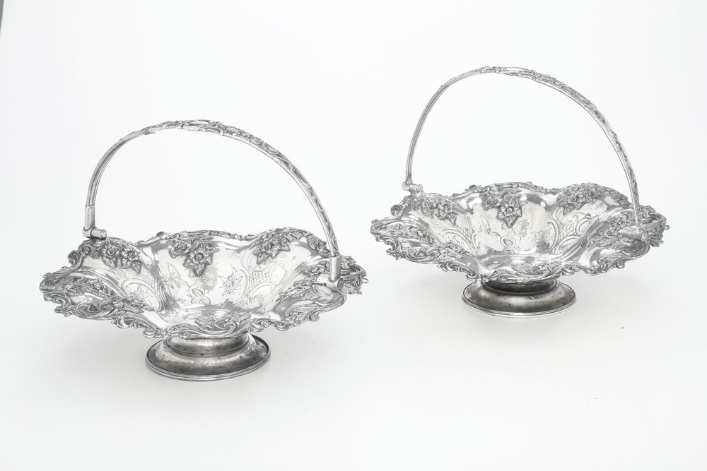 Coppia di cestini con manico in metallo argentato