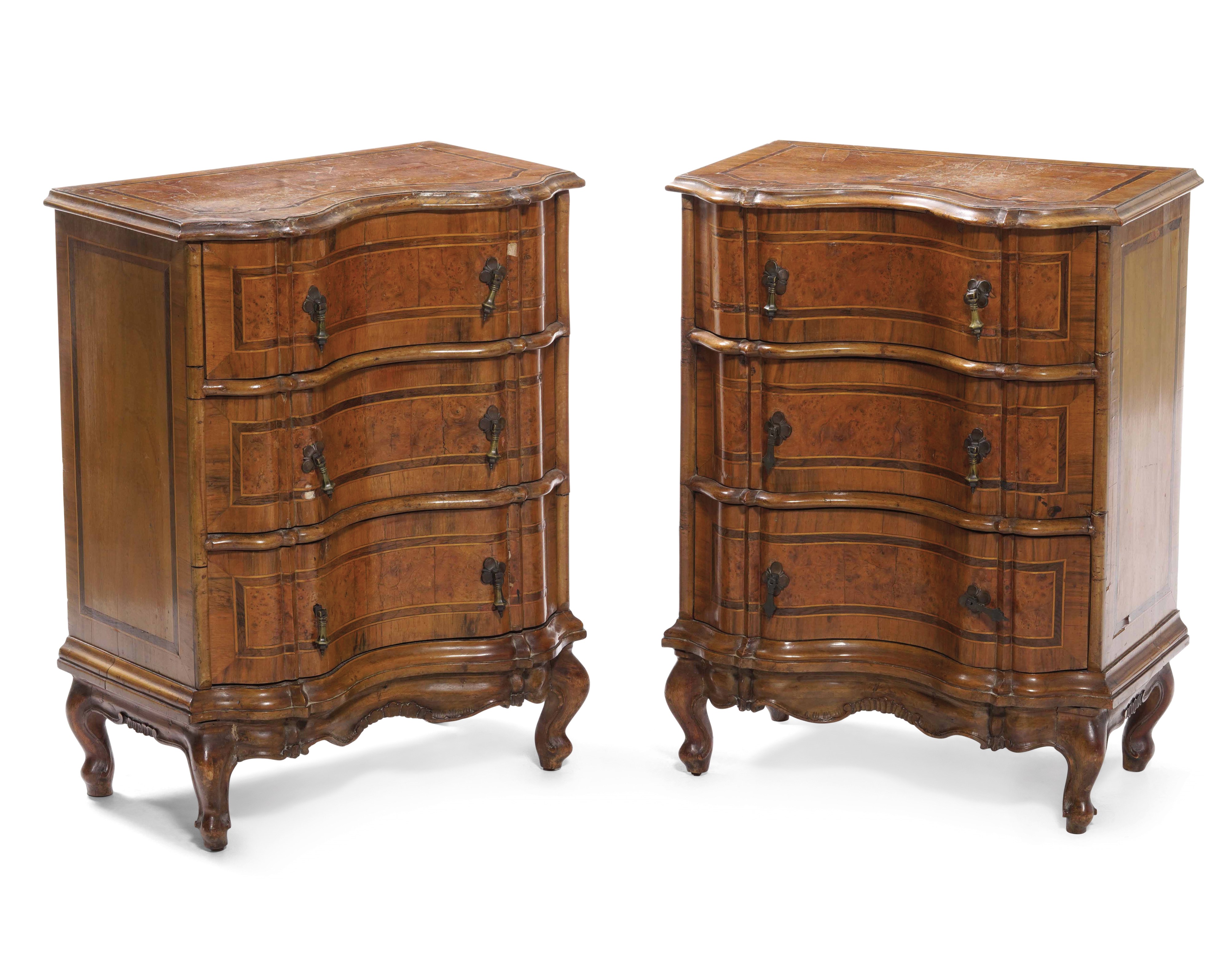 Coppia di comodini in legno lastronato a tre cassetti. XIX-XX secolo