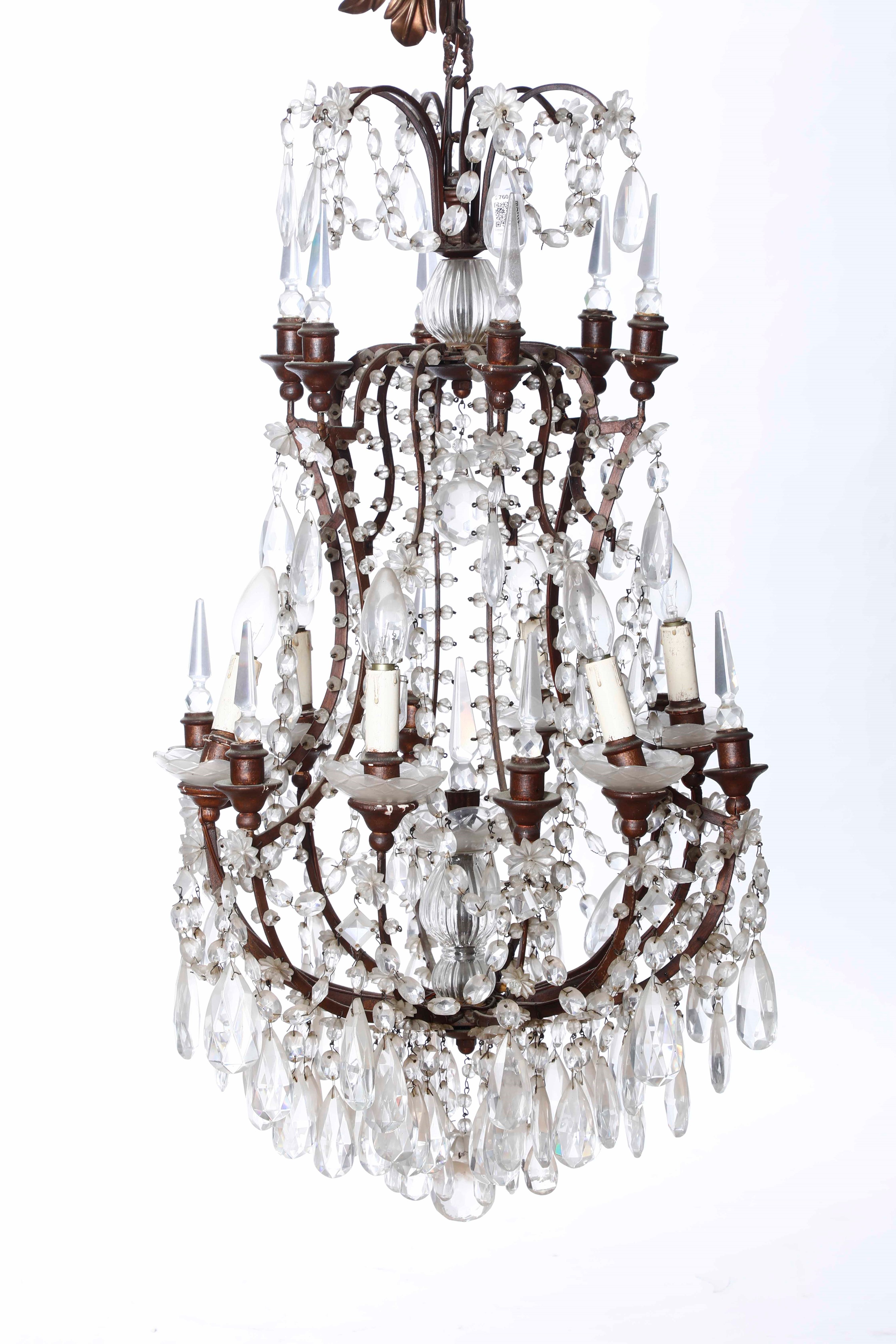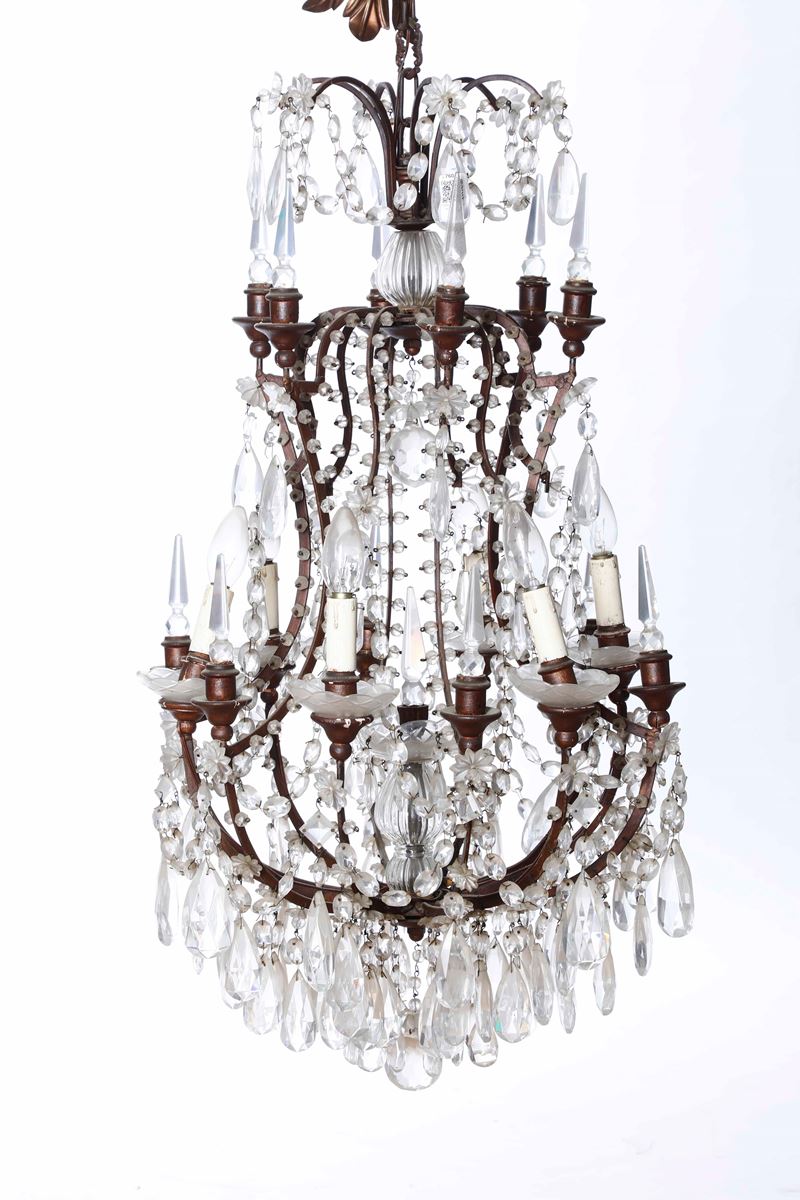 Coppia di lampadari a sei luci in metallo e cristalli. XIX secolo