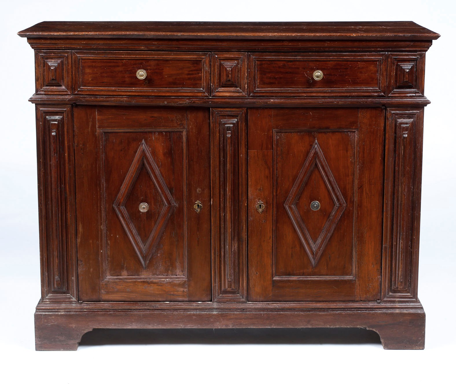 Credenza in noce a due ante e due cassetti. XVII-XVIII secolo