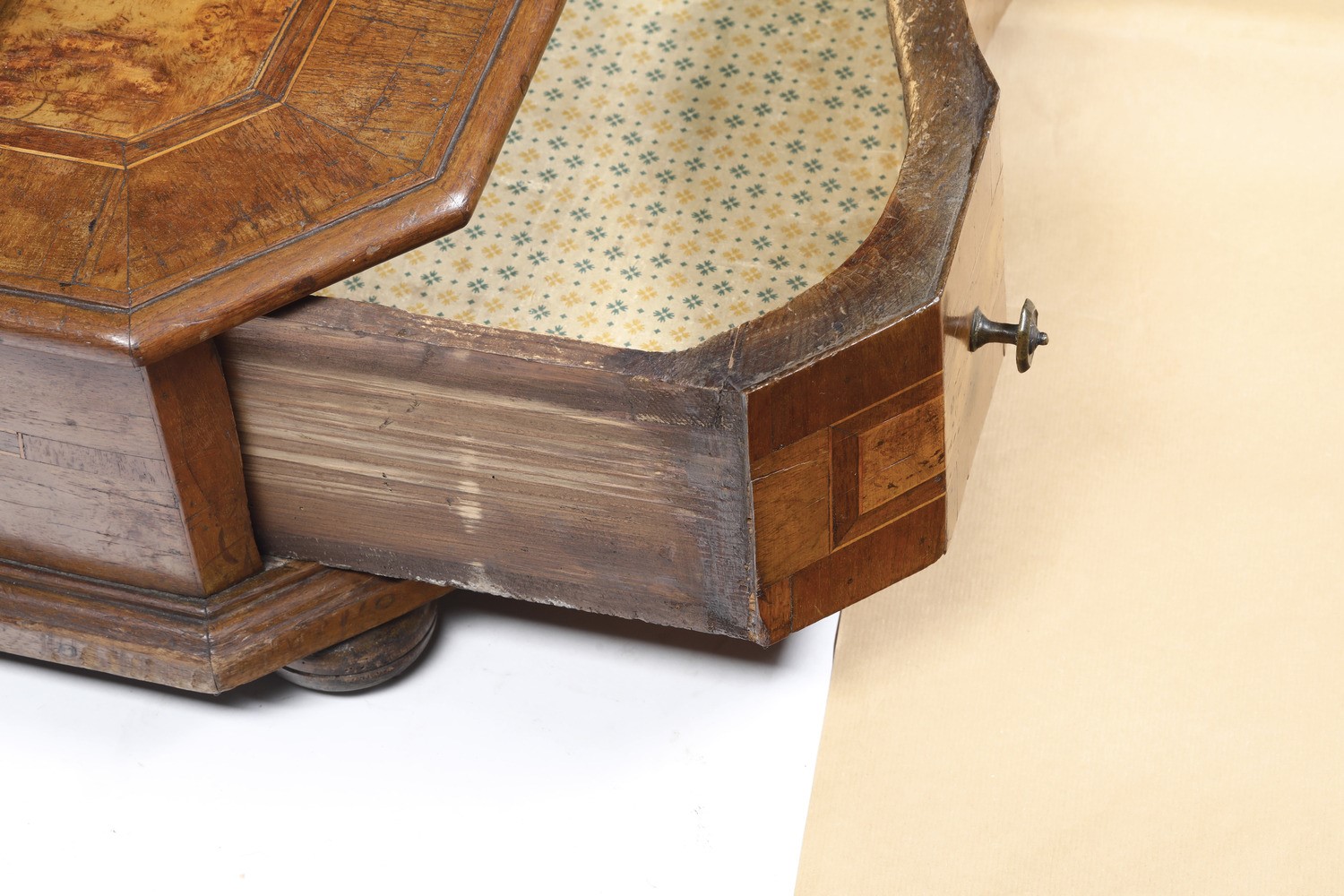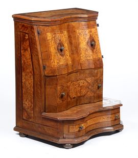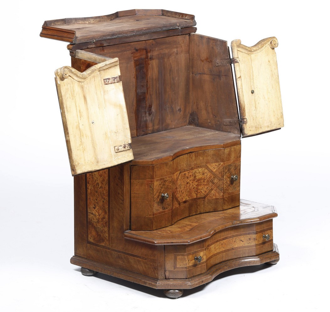 Inginocchiatoio lastronato ed intarsiato in radica. XVIII secolo