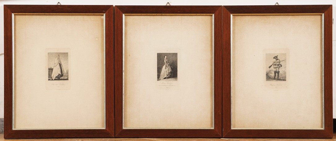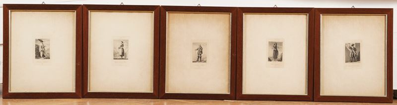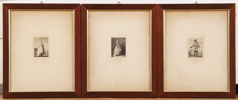 Lotto di 13 acqueforti, 12 costumi d'Italia, 1750, riprodotte nel 1862, e una rappresentazione