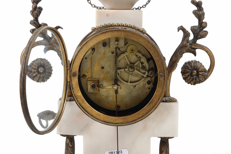 Pendola a portico in alabastro, bronzo dorato, con placchette in biscuit. Francia, XIX secolo