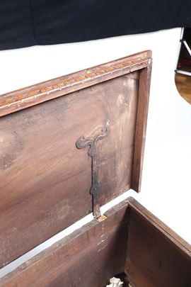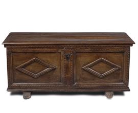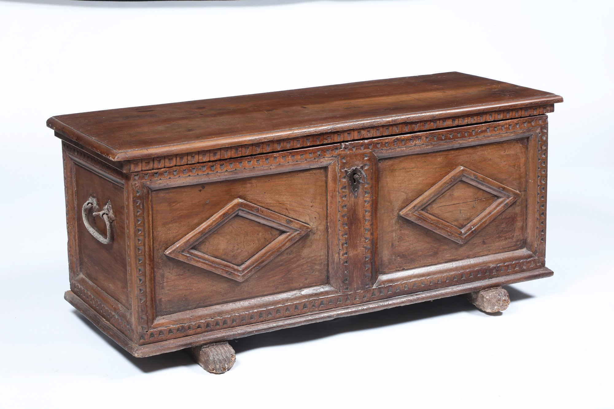 Piccola cassapanca in noce intagliato. XVII-XVIII secolo
