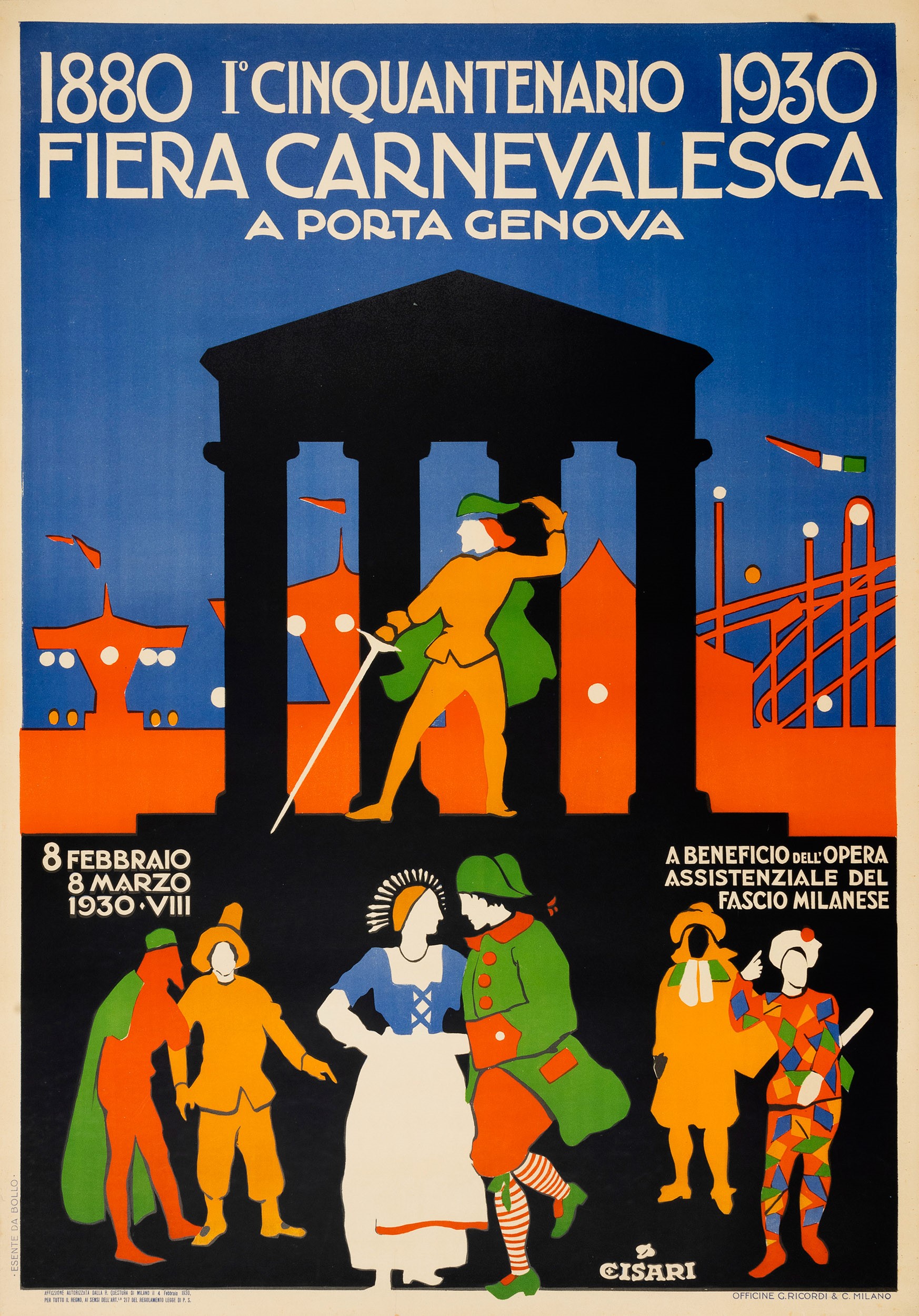 Affisso litografico, 1930. Impresso da Officine G. Ricordi & C. - Milano. Cm 140 x 100. Telato. Qualità A.