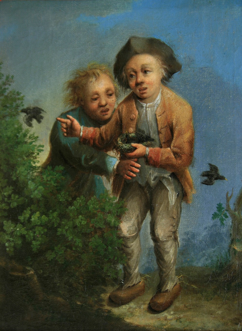 Giovani contadini che giocano con uccellini in un nido