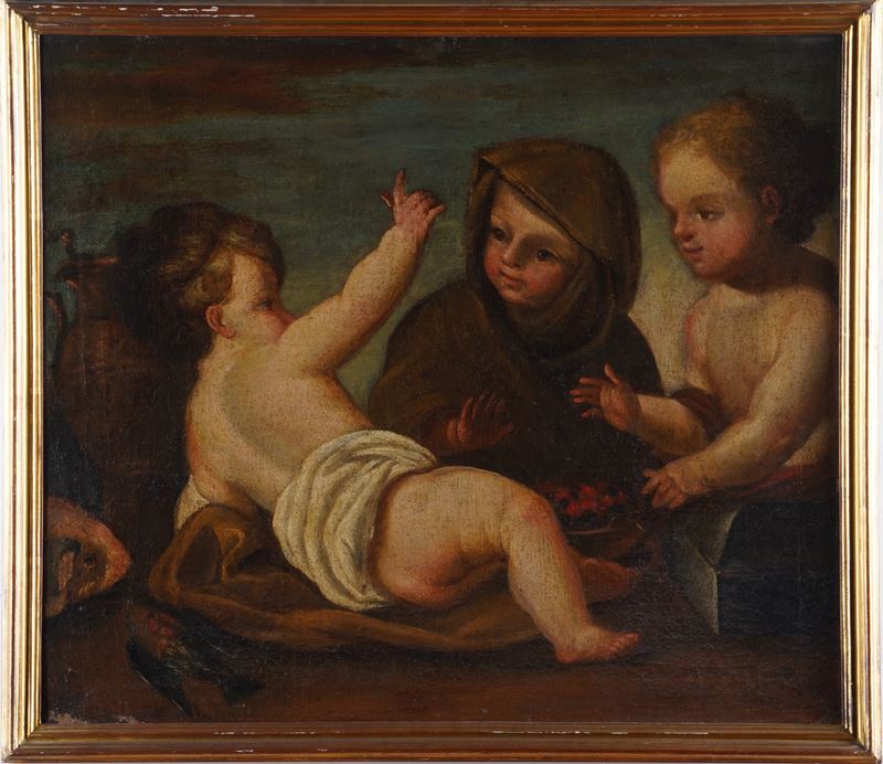 Scuola del XVIII secolo Putti che giocano con natura morta