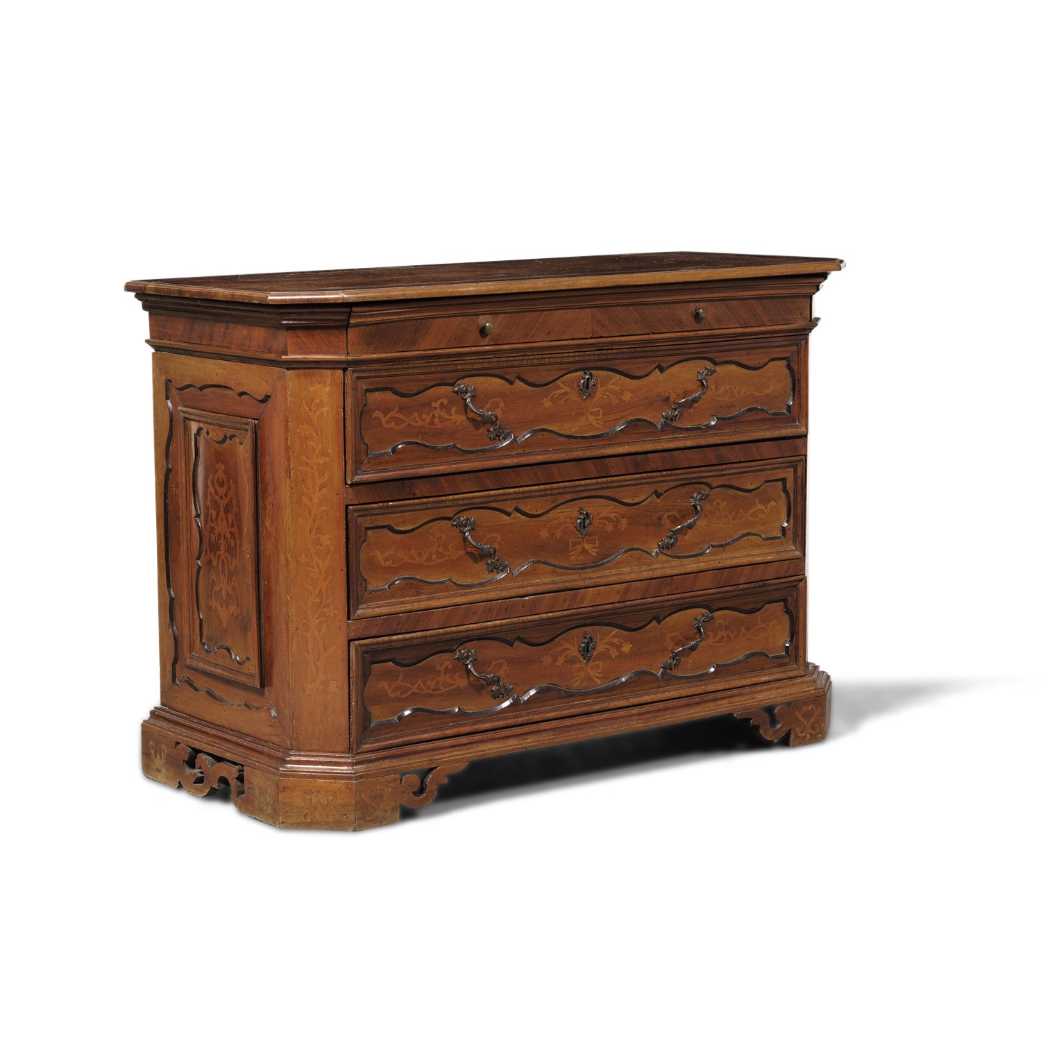 Comò lastronato in noice ed intarsiato in legno chiaro. XVIII secolo