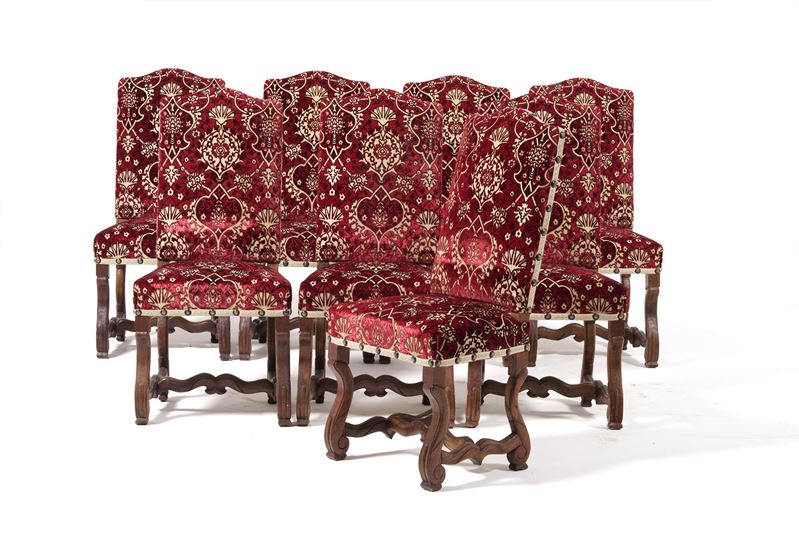 Otto sedie e due poltrone rivestite in tessuto rosso damascato