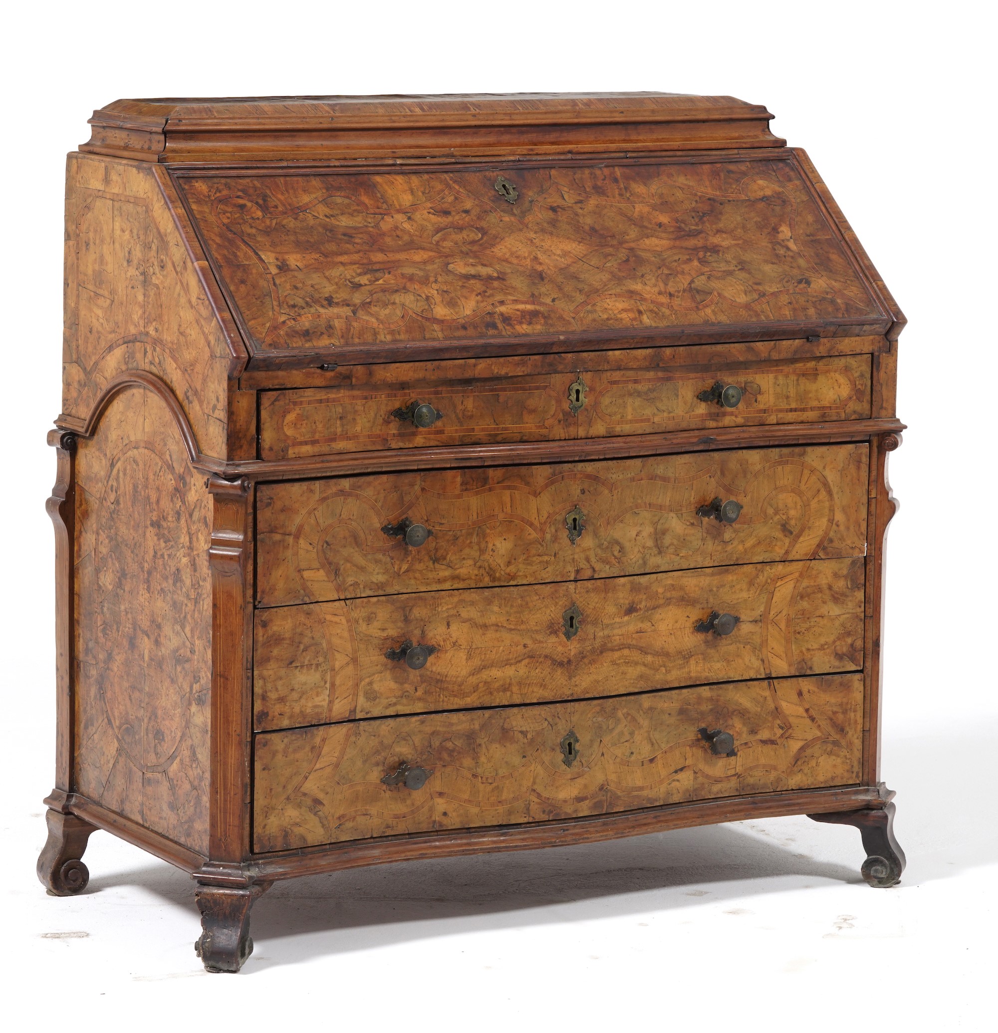 quattro cassetti e anta a ribalta. All'interno scarabattolo con sei cassetti. Piano con alzata con cassettini laterali.