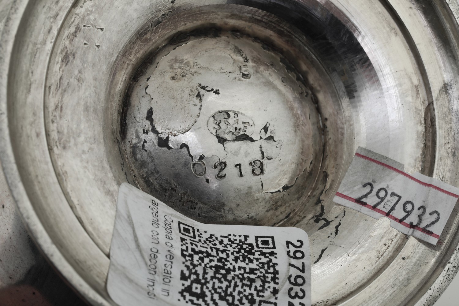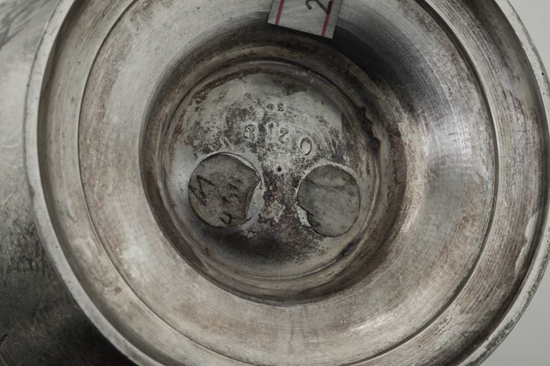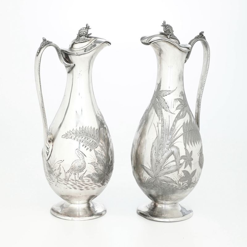 Coppia di versatoi in metallo argentato con decori incisi. XX secolo