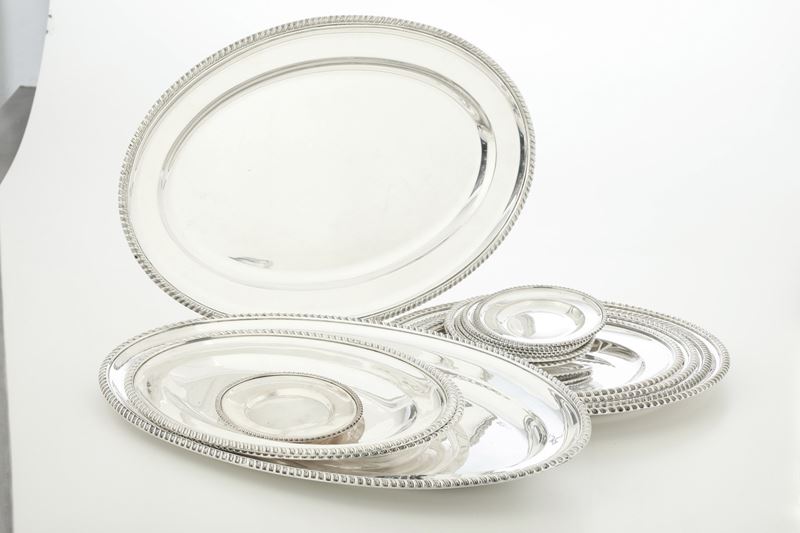 Gruppo di oggetti in metallo argentato con marchio ‘Jannetti’
