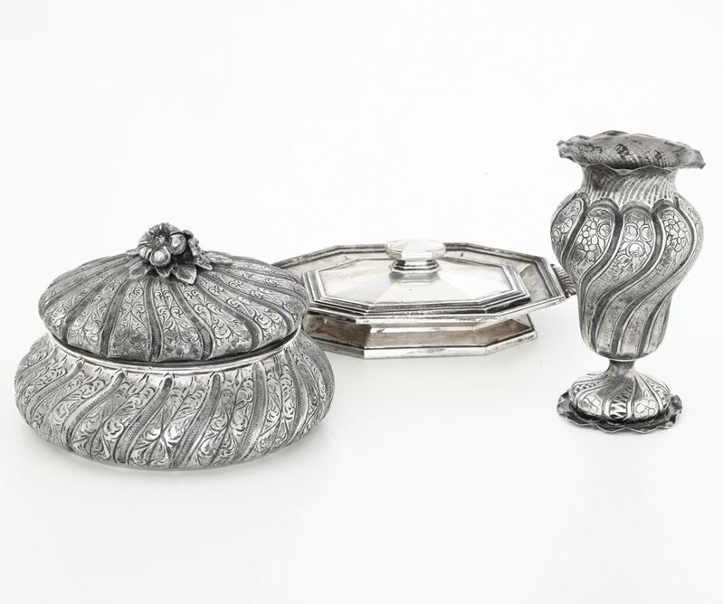 Lotto di tre oggetti in argento. Argenteria italiana del XX secolo, argentieri differenti