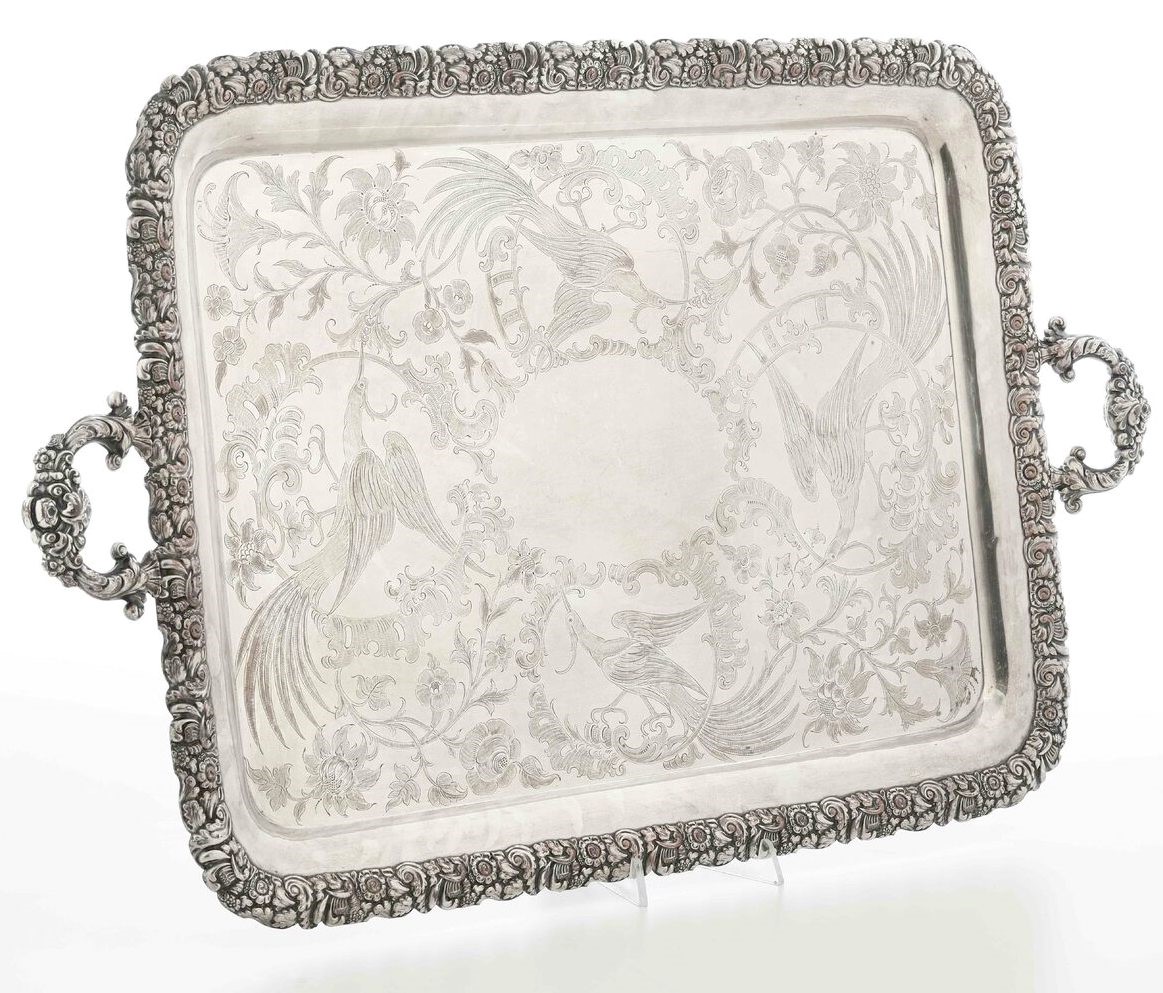 Vassoio biansato in metallo argentato. XX secolo