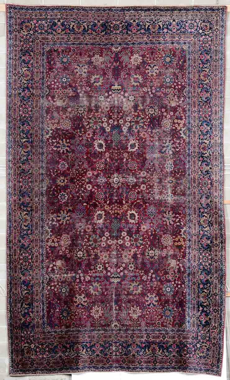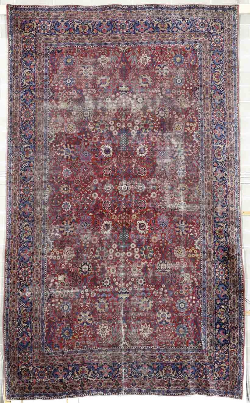campo rosso scuro con fiori, bordura blu con cartiglio.