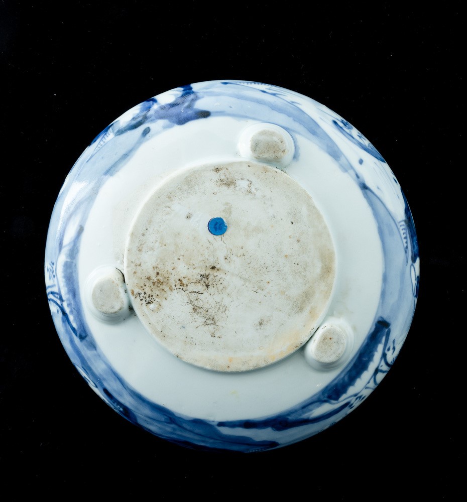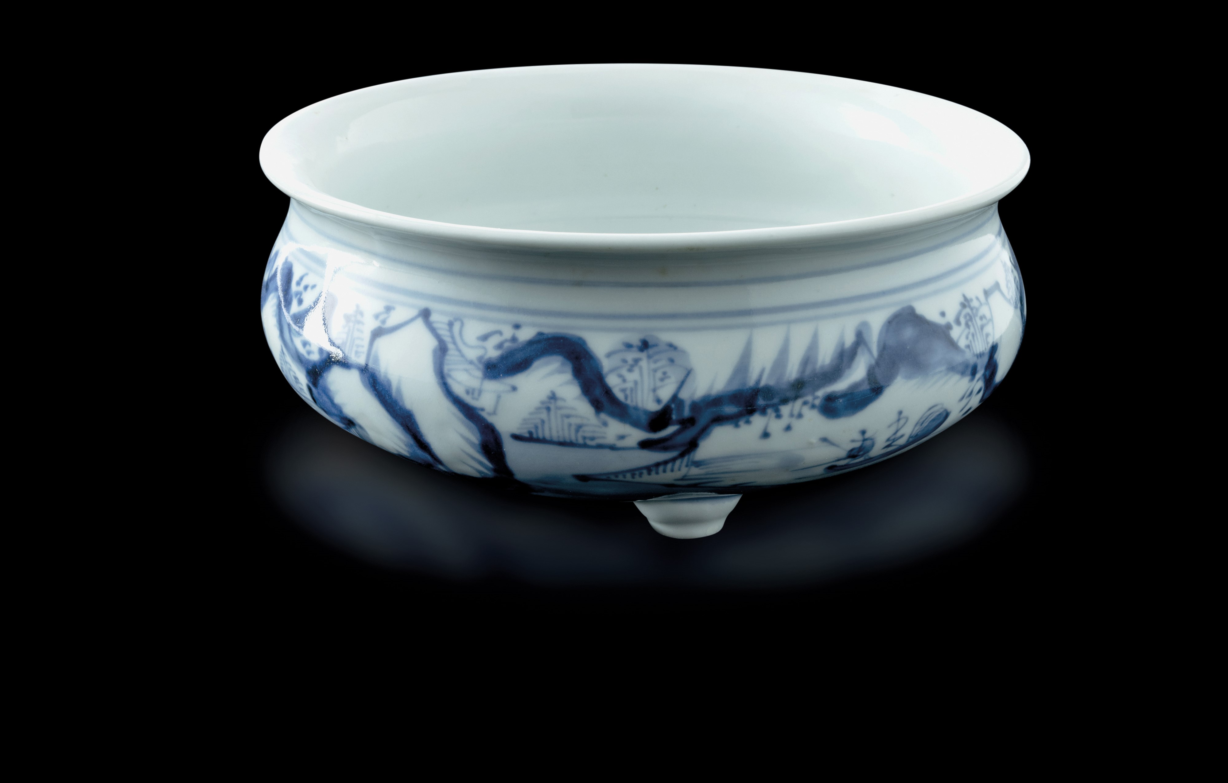 Censer tripode in porcellana bianca e blu a decoro paesaggistico, Cina, Dinastia Qing, epoca Qianlong (1736-1796)