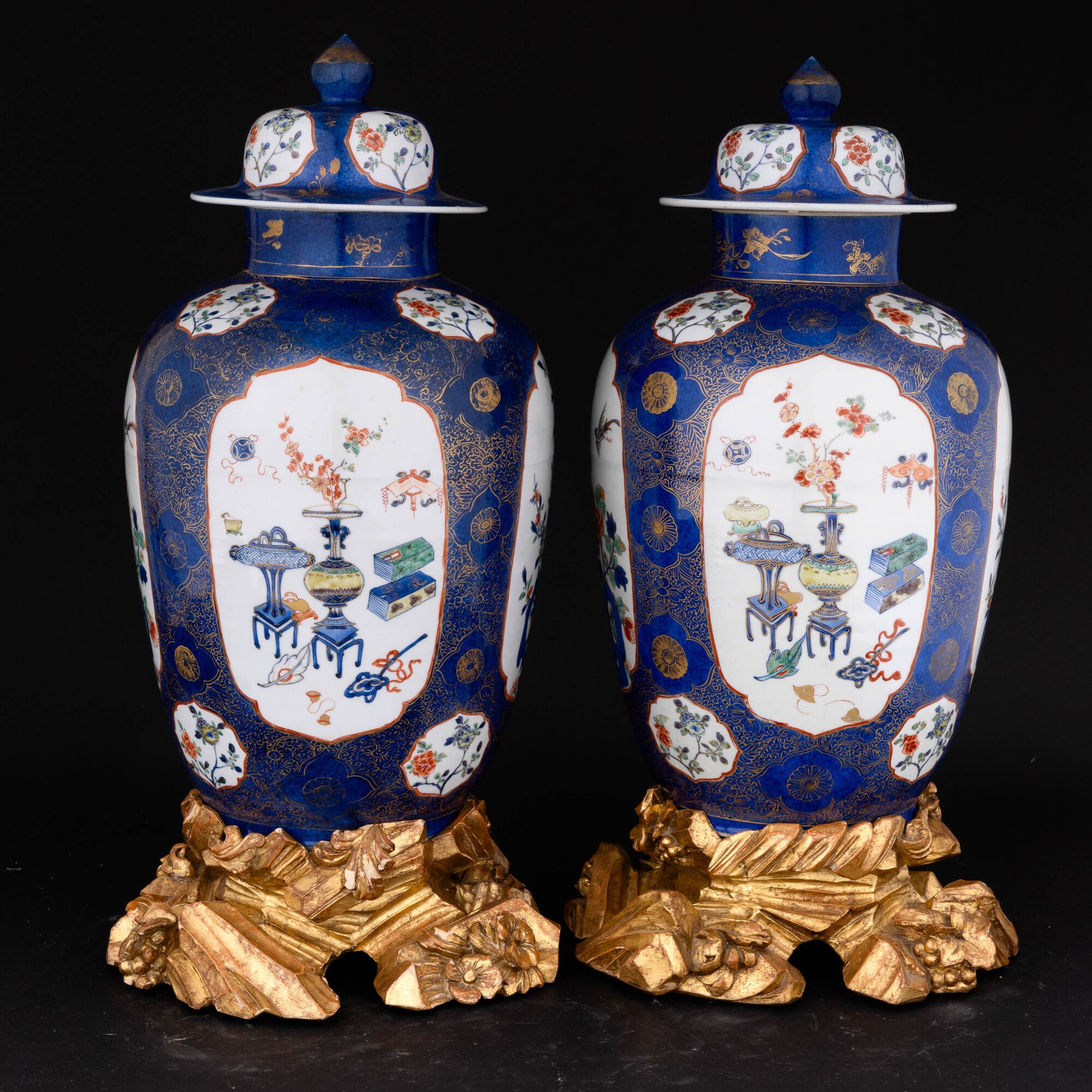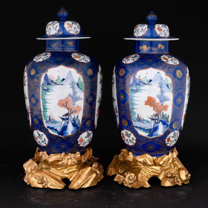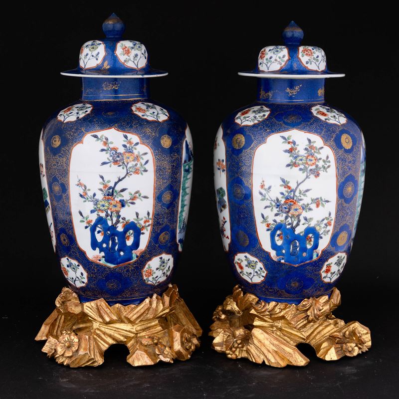 Coppia di potiche Blu Poudre con riserve a decoro naturalistico Famiglia Verde poggianti su basi dorate antiche a foggia di pietre, Dinastia Qing, epoca Kangxi (1662-1722)