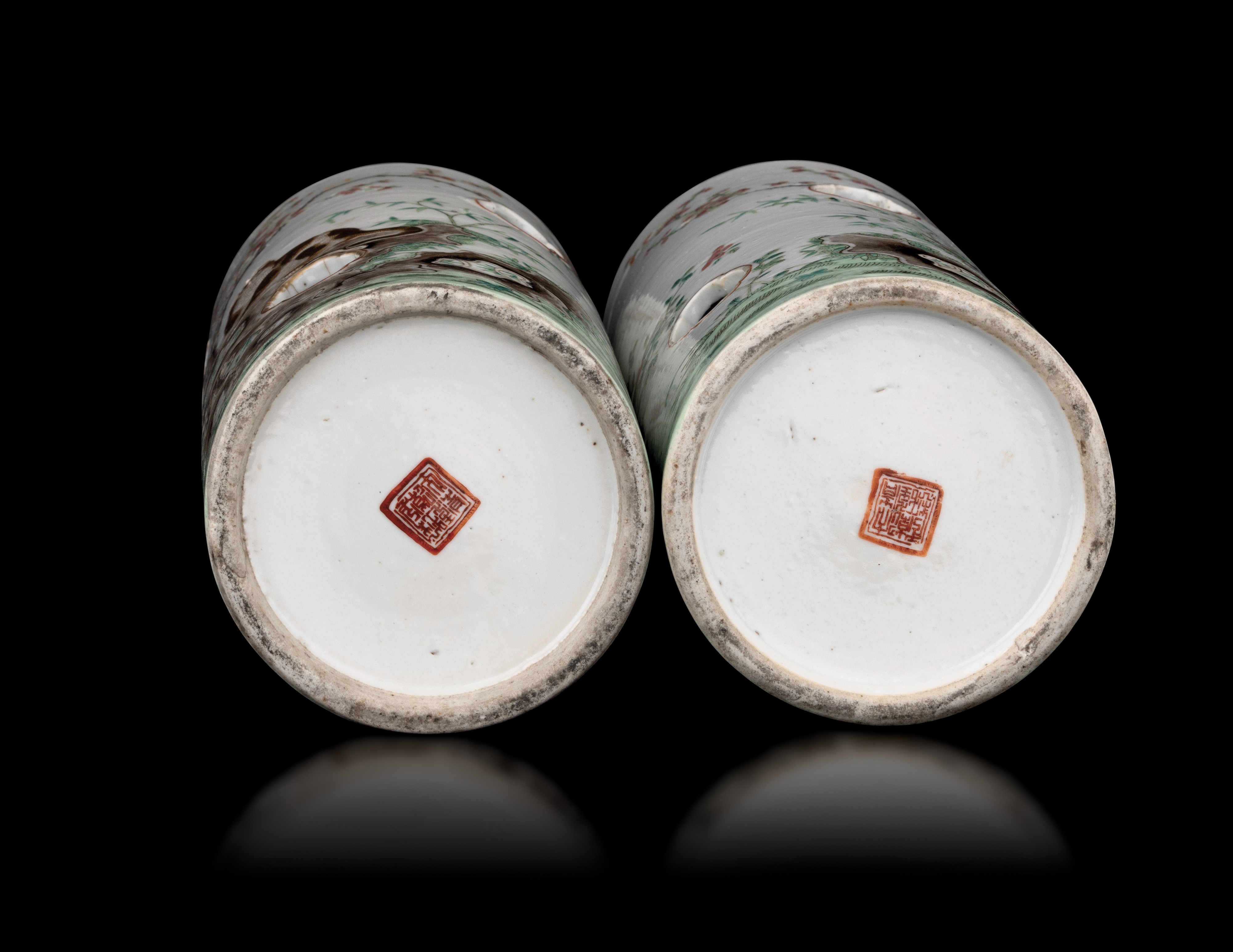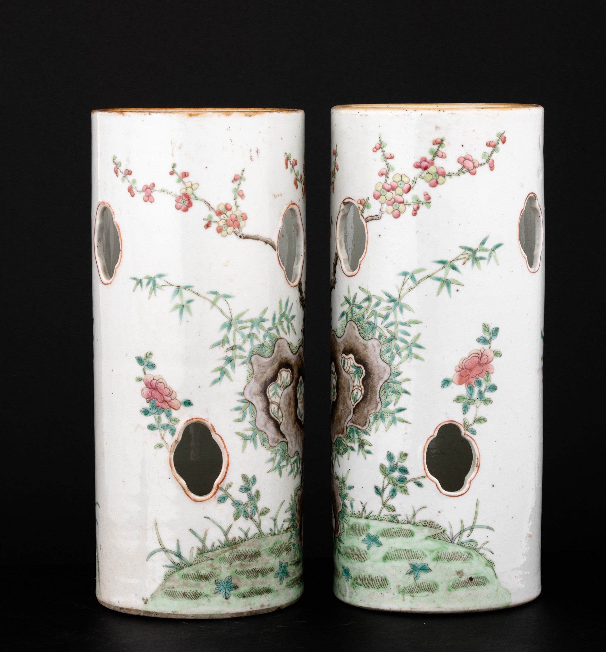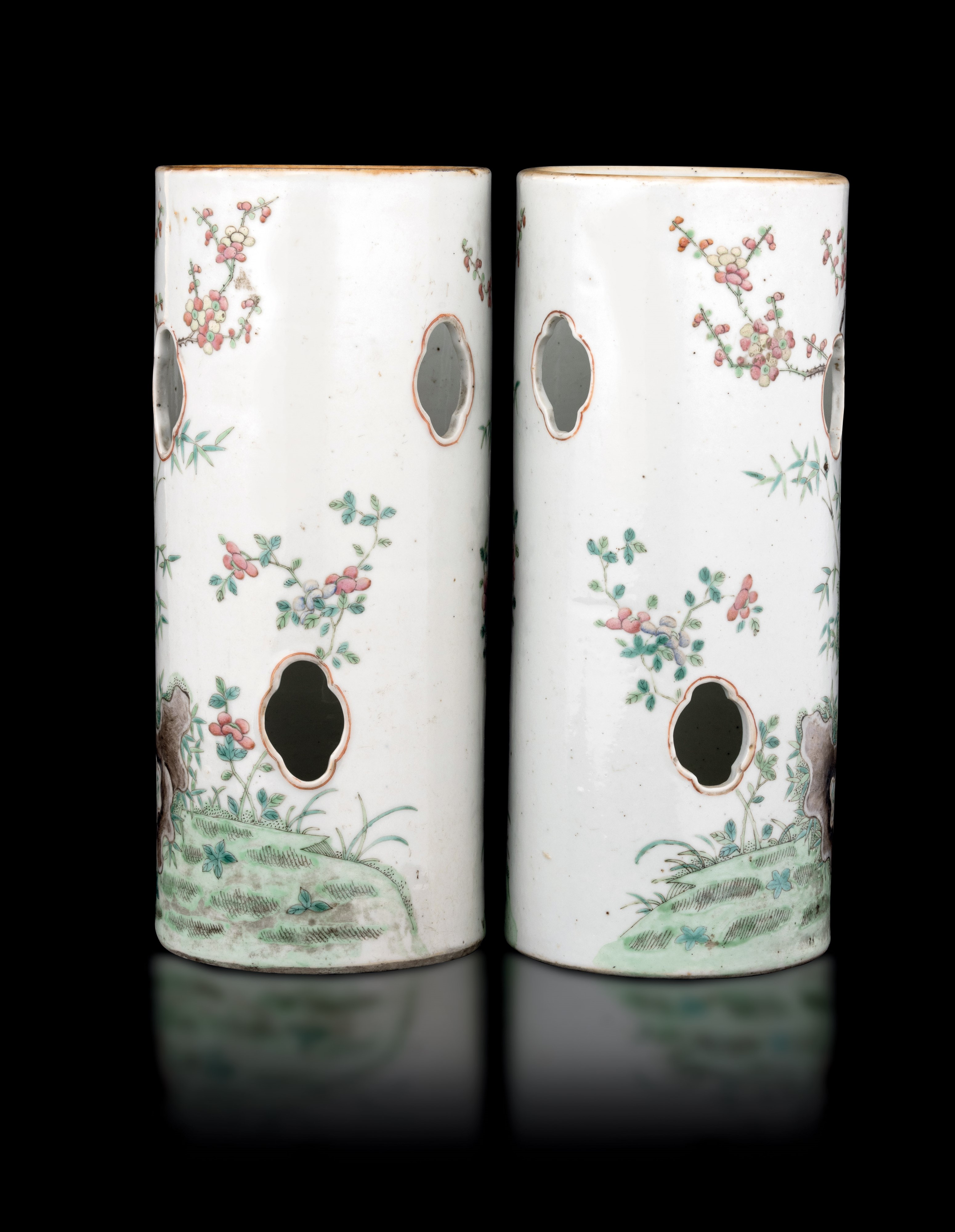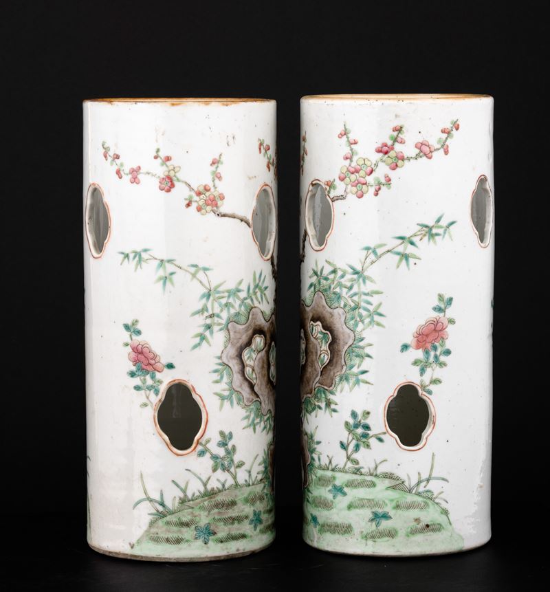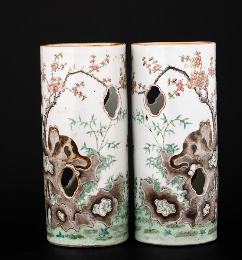 Coppia di vasi cilindrici porta cappelli in porcellana con decoro a smalti policromi a traforo raffigurante gatti, Cina, [..]