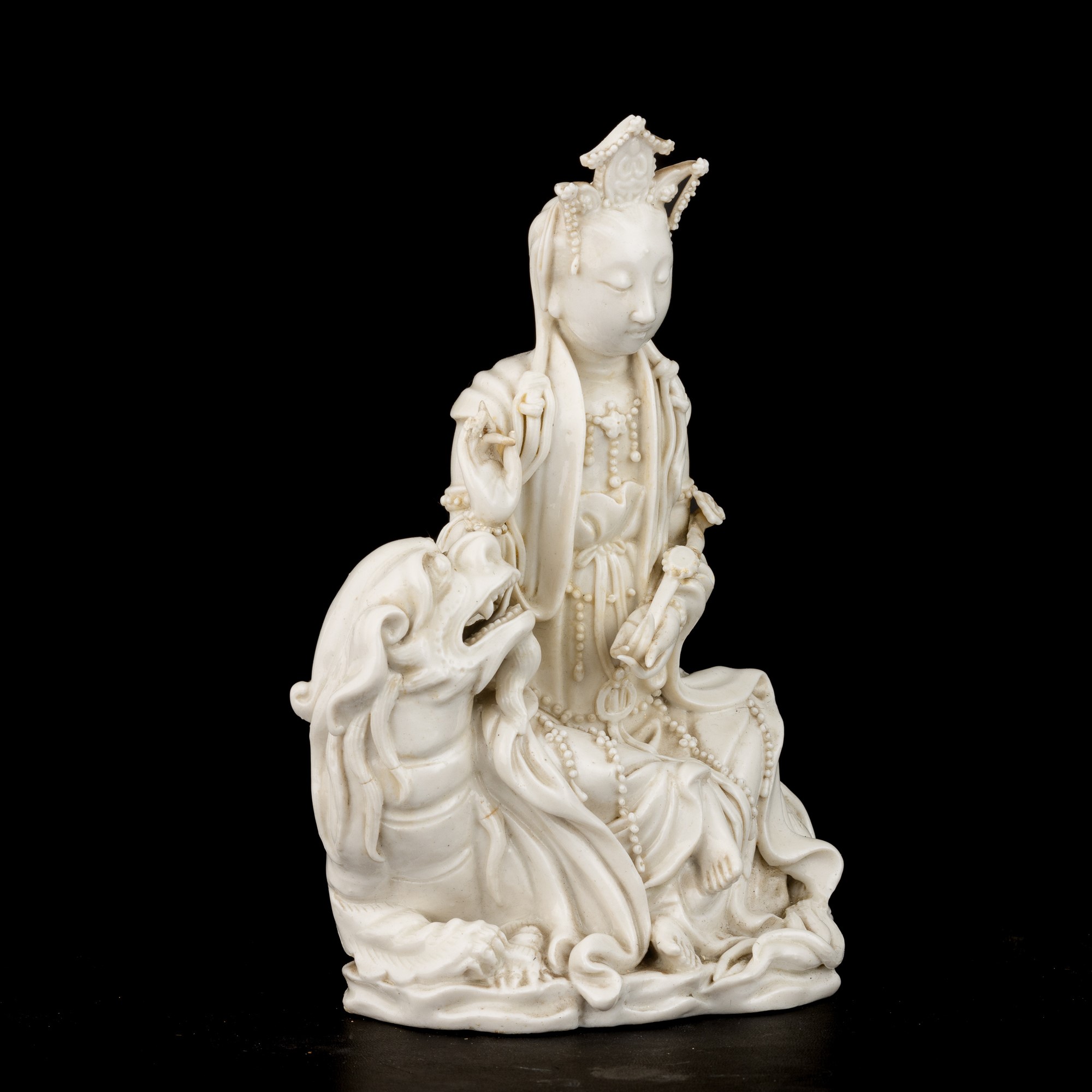 Figura Guanyin su leone in porcellana Dehua, Blanc de Chine, marca incussa Dehua con scatola, Cina, Dinastia Qing, XVIII secolo