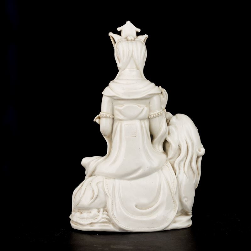 Figura Guanyin su leone in porcellana Dehua, Blanc de Chine, marca incussa Dehua con scatola, Cina, Dinastia Qing, XVIII [..]