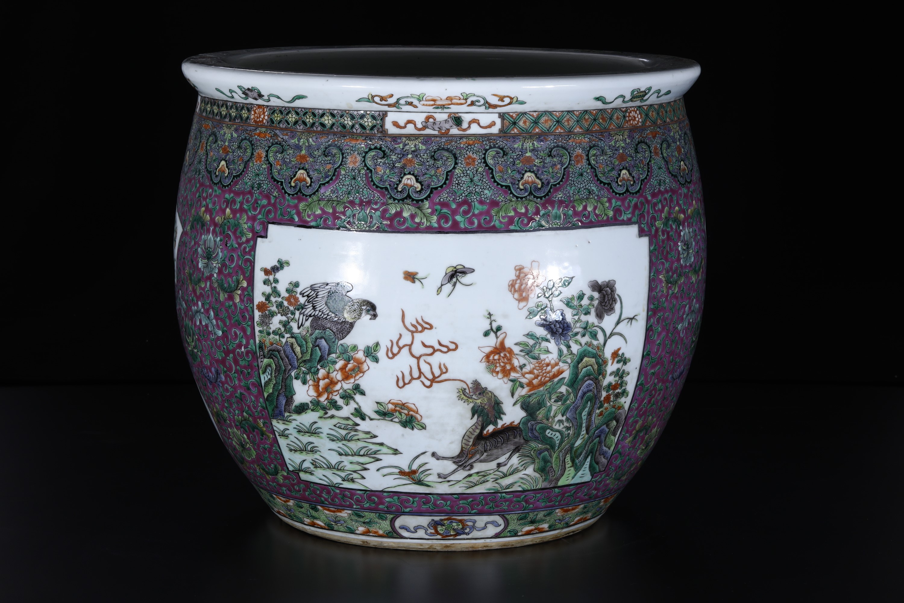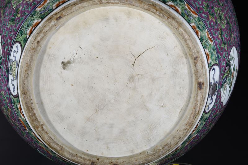 Fish Bowl in porcellana Famiglia Verde con decori naturalistici e uccelli, Cina, Dinastia Qing, epoca Guangxu, XX secolo