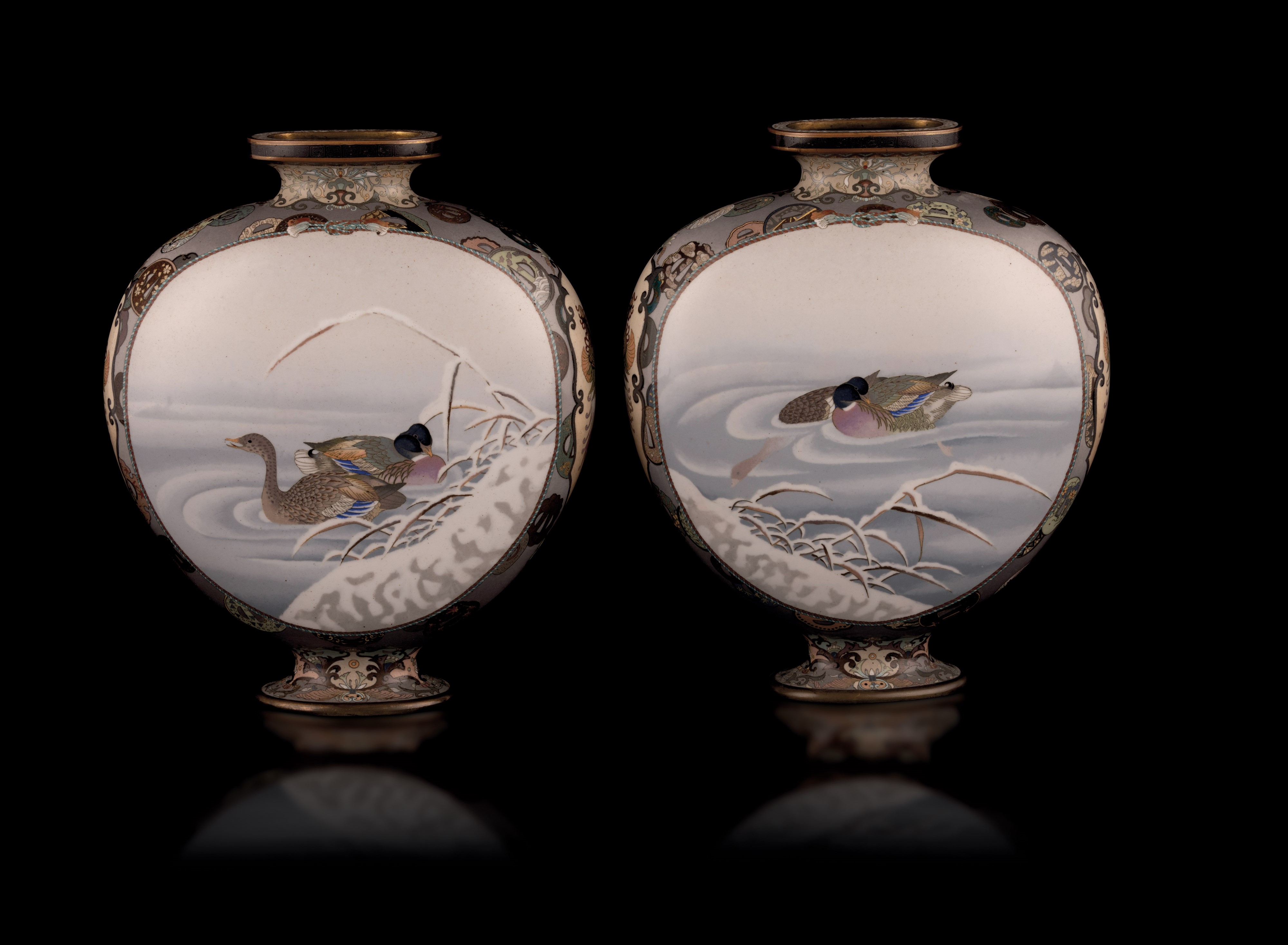 Rara coppia di Moon Flask cloisonné con figure di samurai e di anatre nello stagno in paesaggio invernale, Giappone, periodo Meiji (1868-1912)
