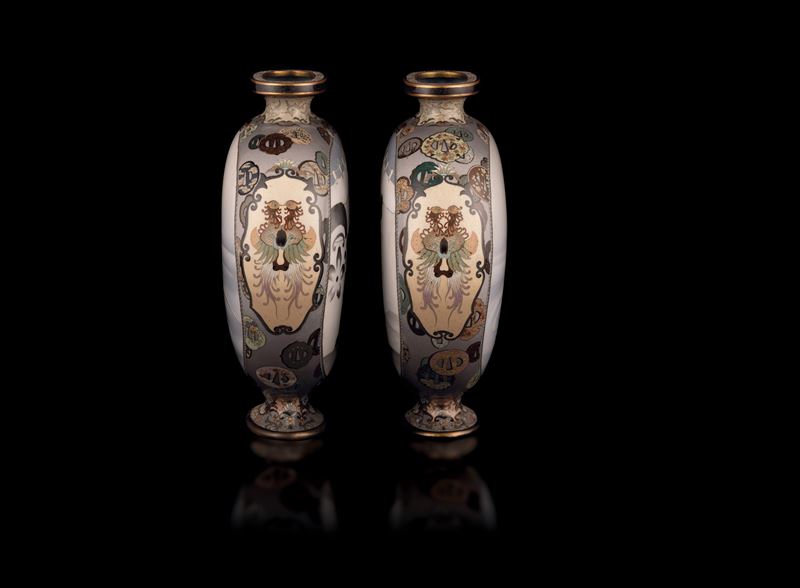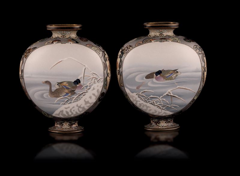 Rara coppia di Moon Flask cloisonné con figure di samurai e di anatre nello stagno in paesaggio invernale, Giappone, periodo [..]