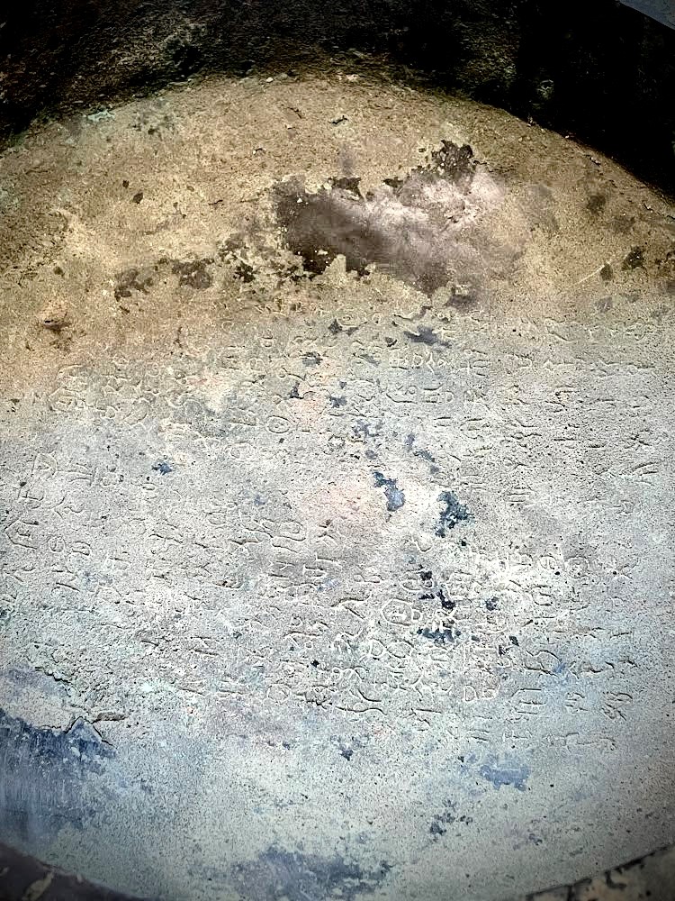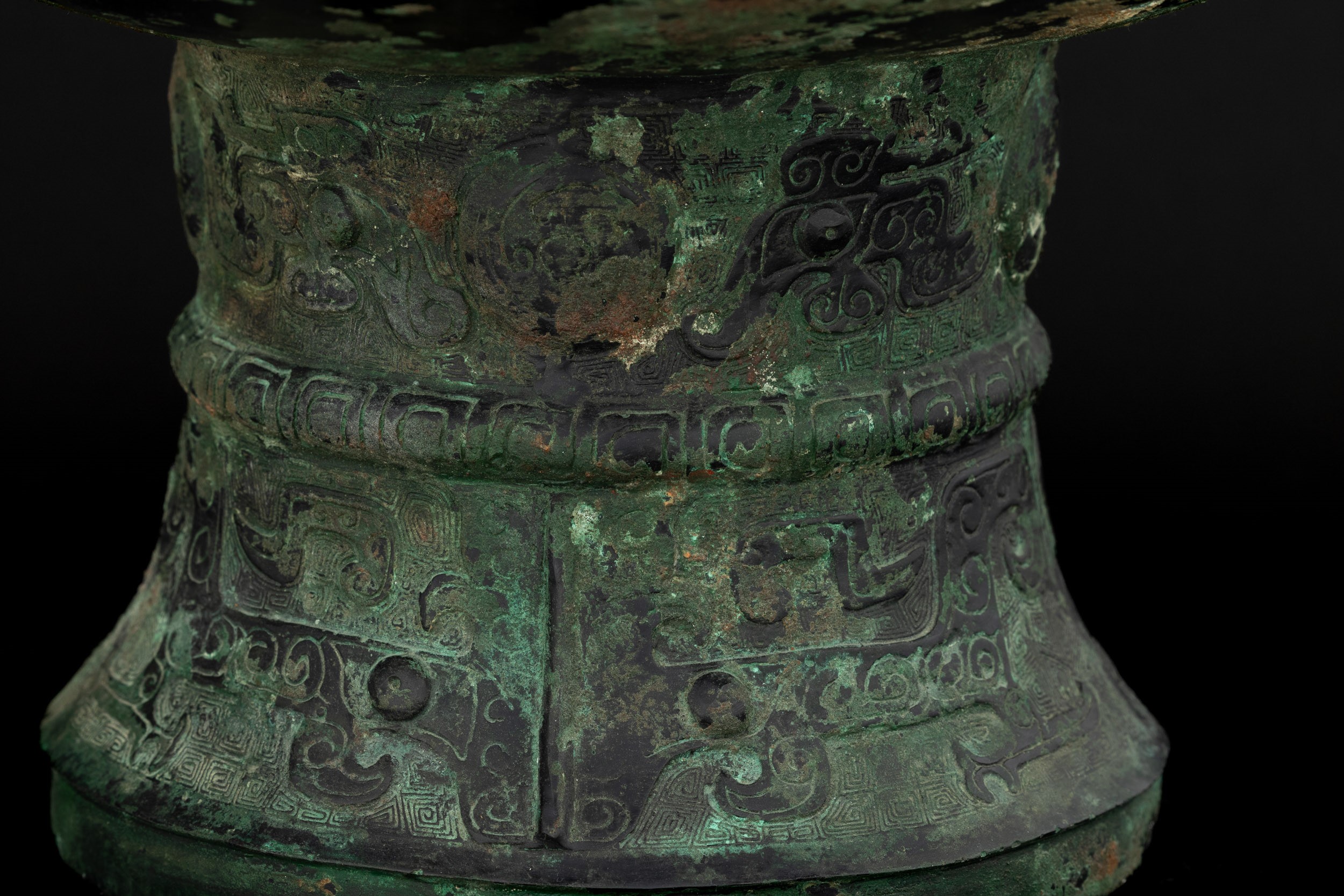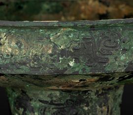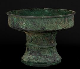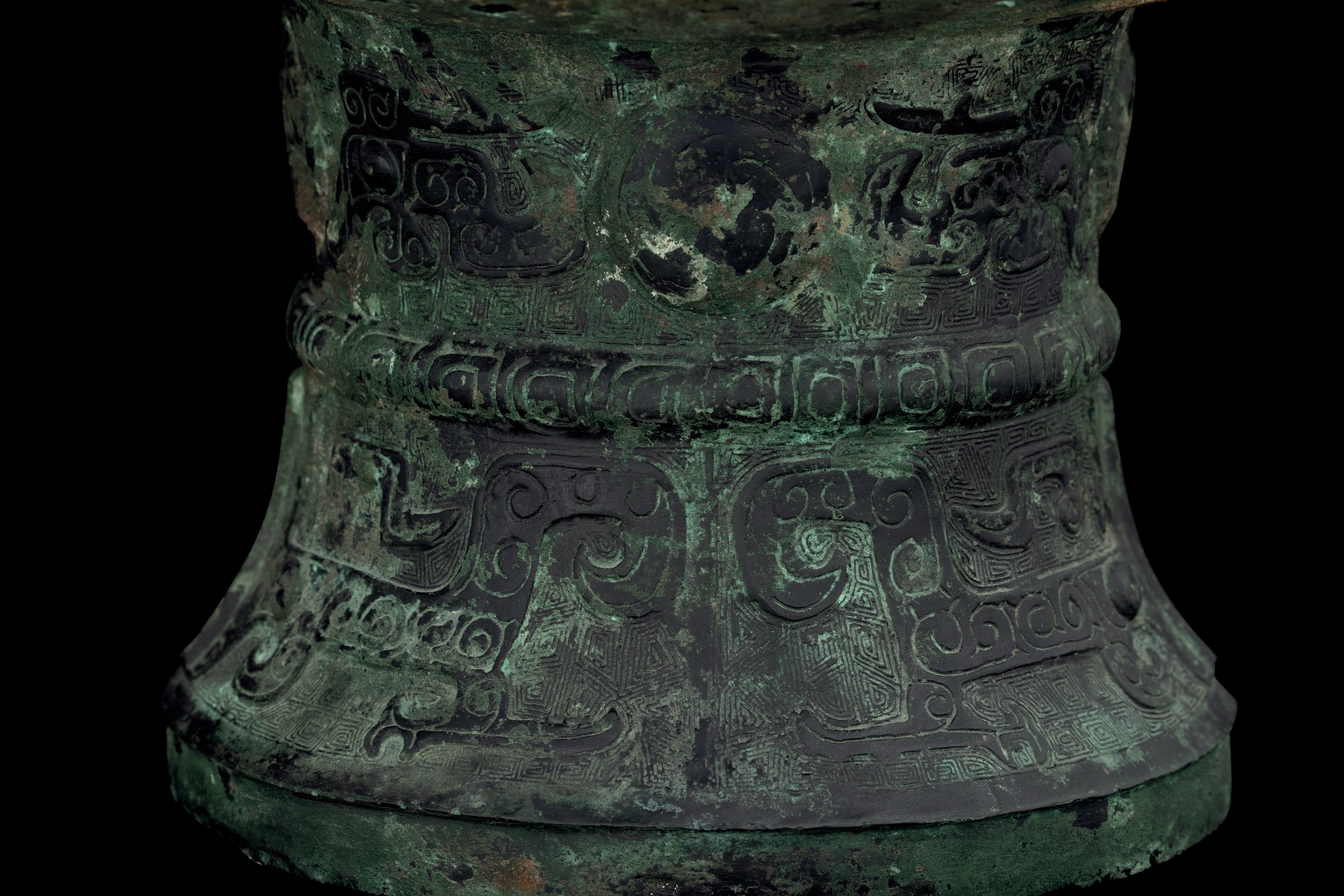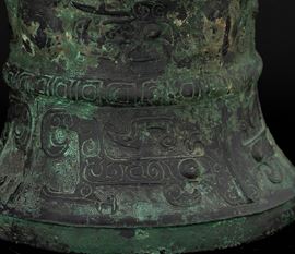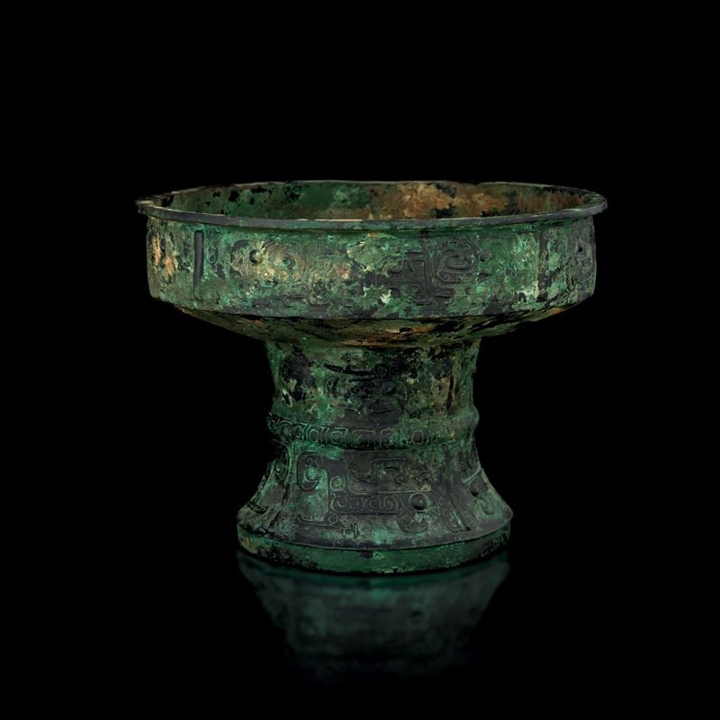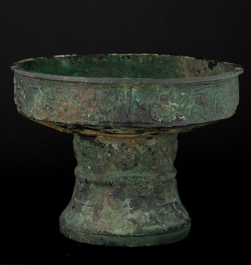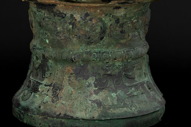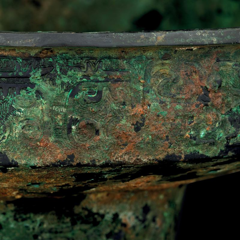 Raro e importante incensiere in bronzo inciso con motivo Taotie e decori geometrici, all'interno iscrizioni in lingua arcaica, Cina, Dinastia Shang