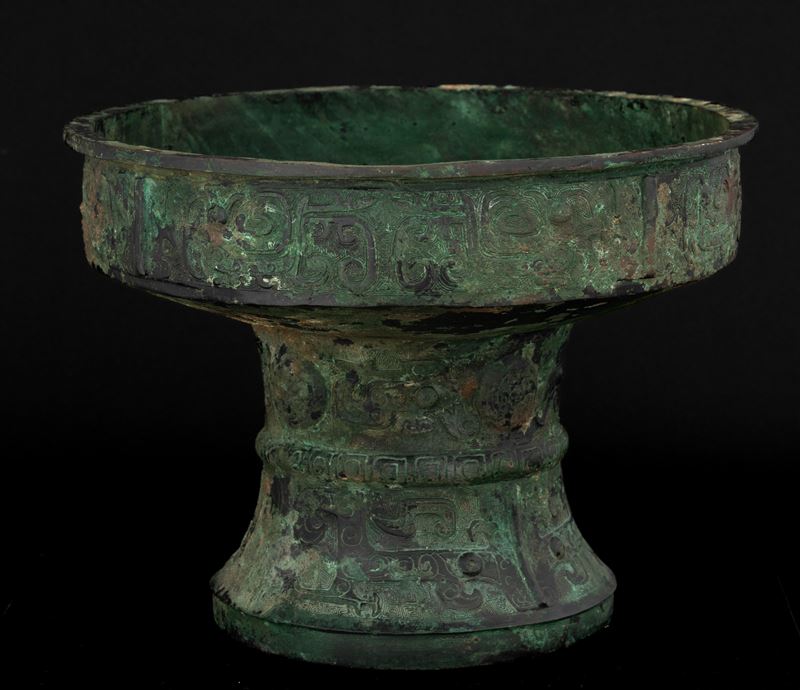 Raro e importante incensiere in bronzo inciso con motivo Taotie e decori geometrici, all'interno iscrizioni in lingua arcaica, [..]