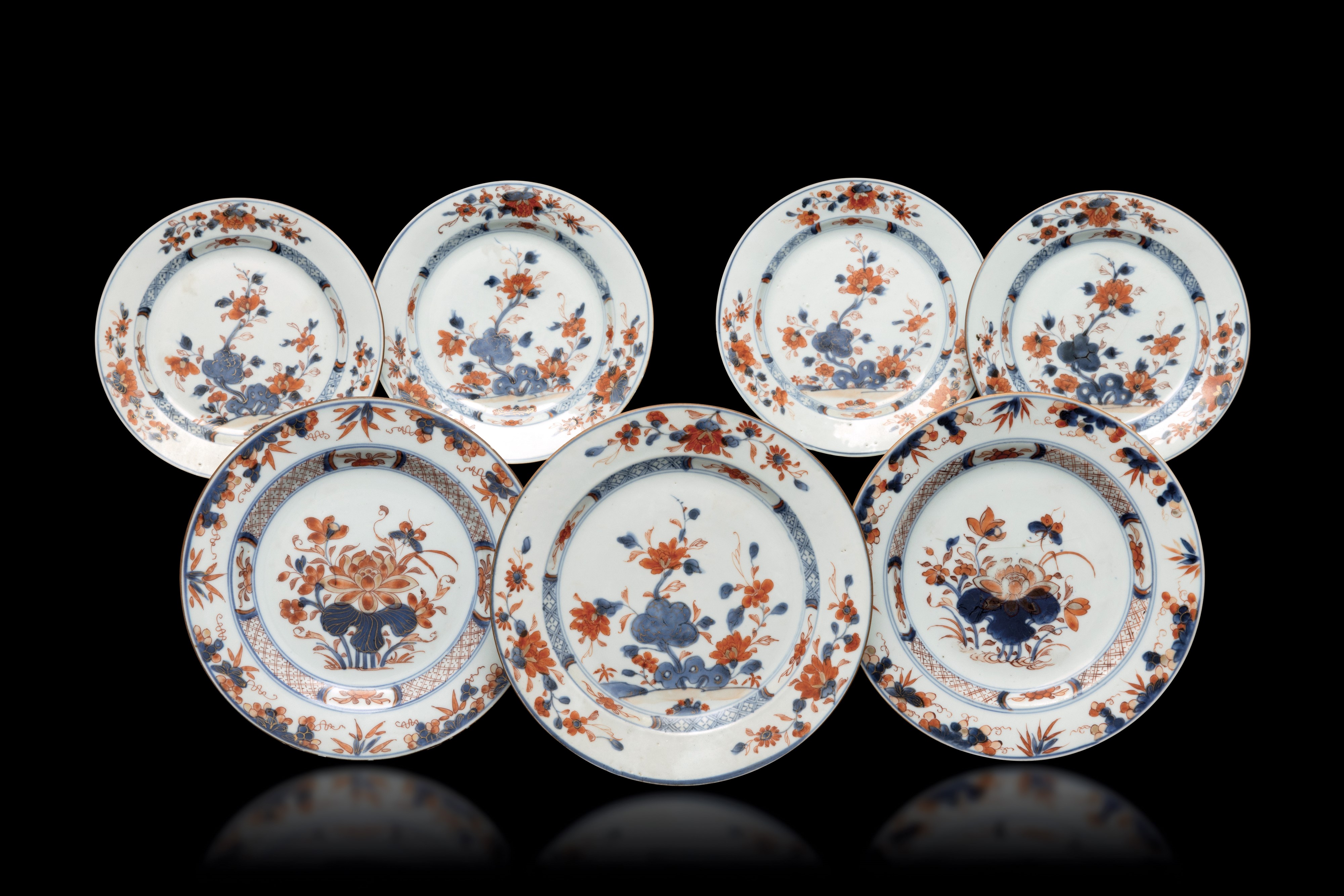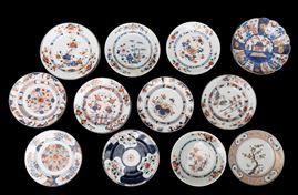 Collezione di ventuno piatti, 3 piatti Famiglia Rosa e 18 piatti stile Imari, Cina, XVIII secolo