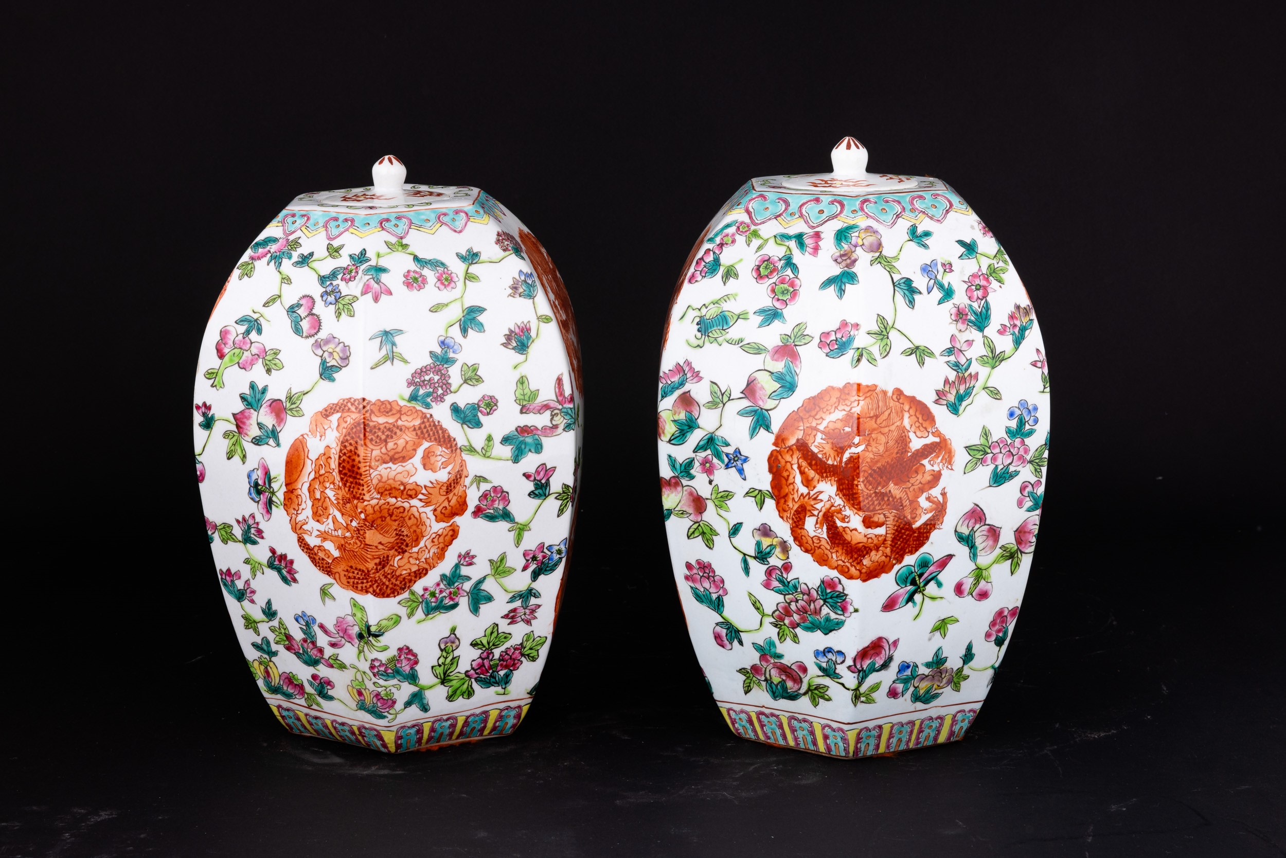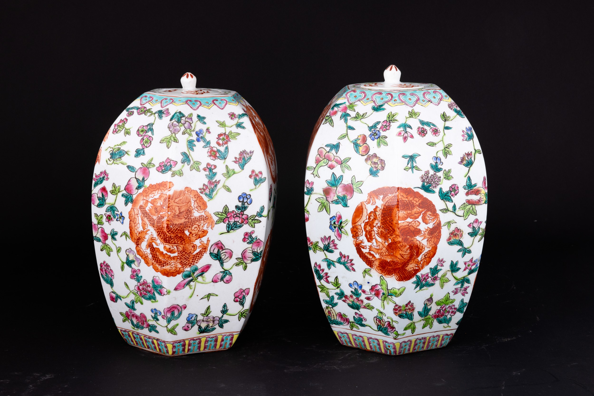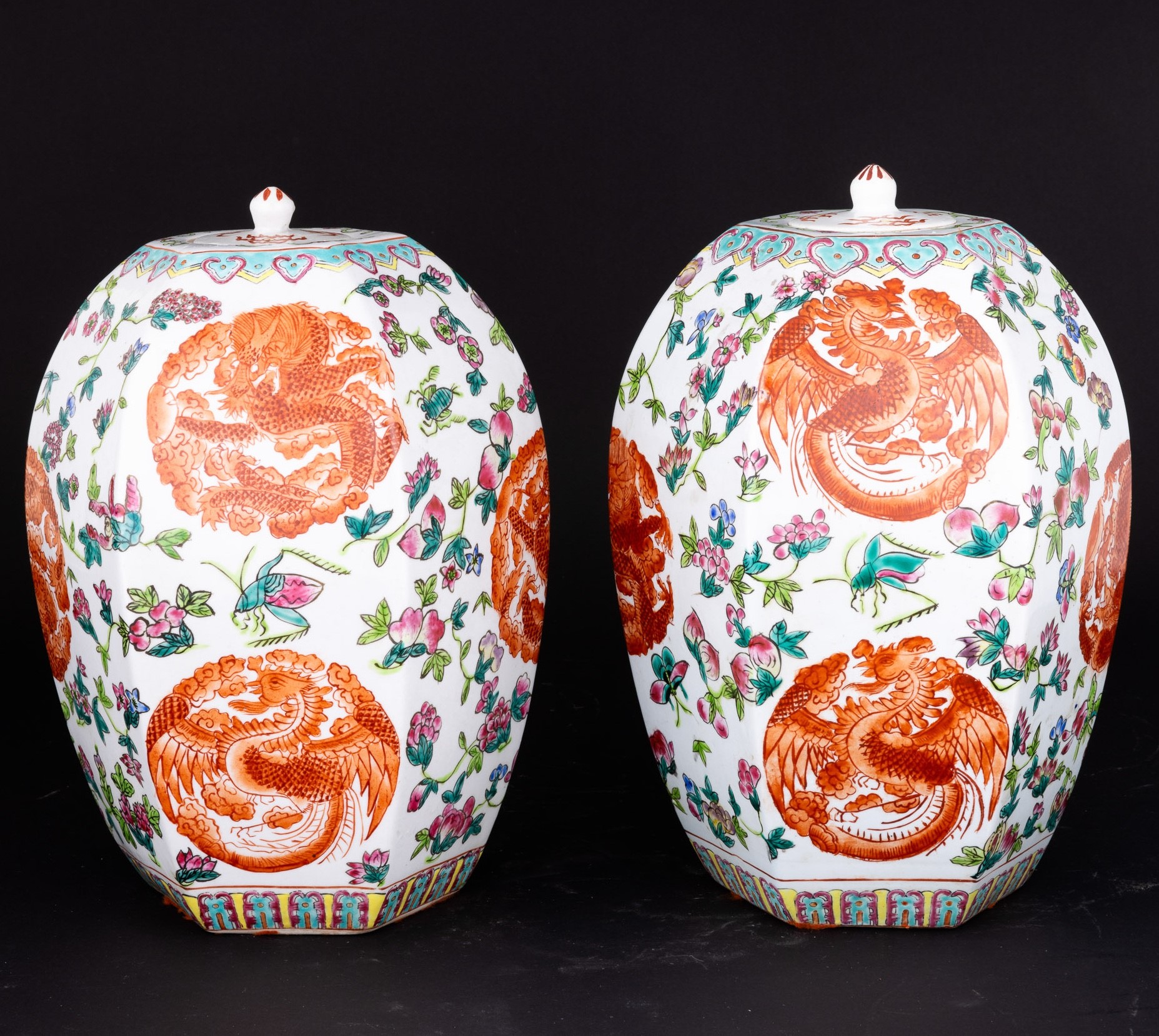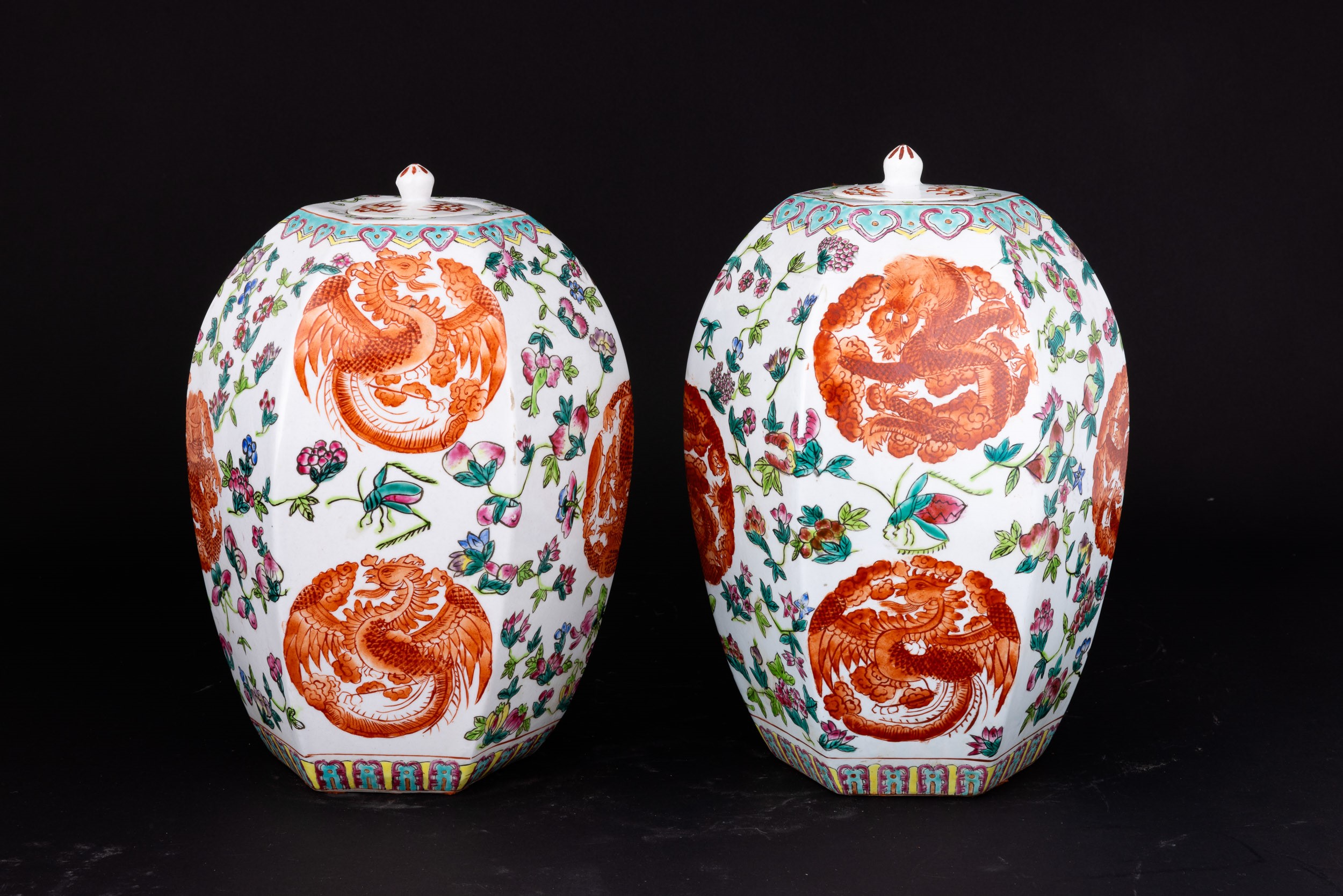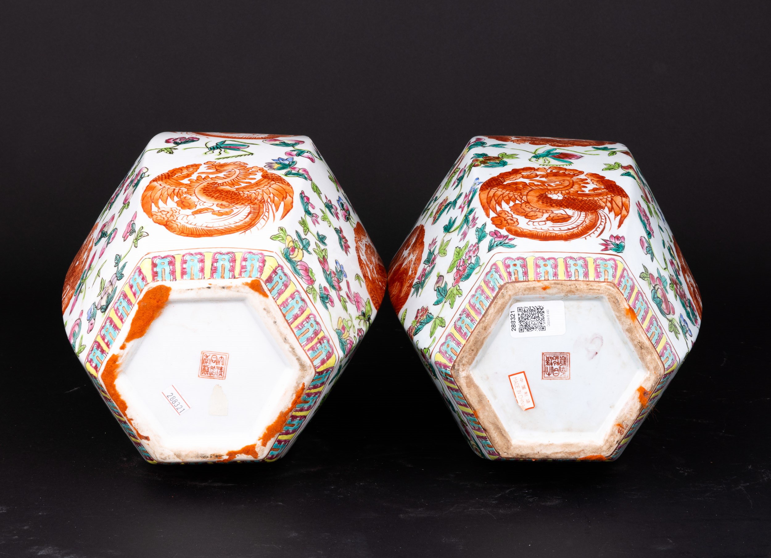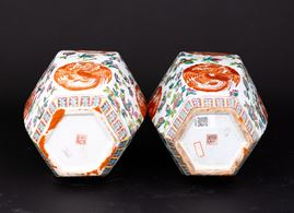 Coppia di vasi in porcellana Famiglia Rosa a pianta esagonale con motivi floreali e fenice, Cina, Dinastia Qing, XX secolo