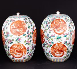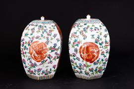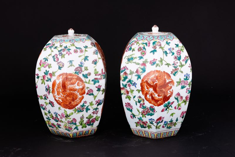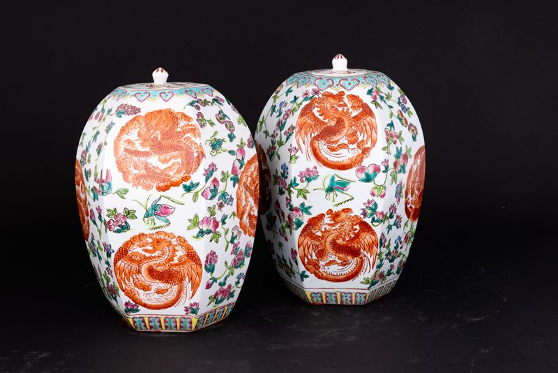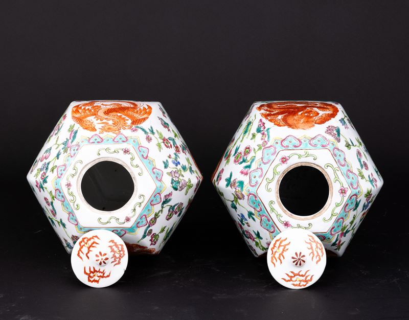 Coppia di vasi in porcellana Famiglia Rosa a pianta esagonale con motivi floreali e fenice, Cina, Dinastia Qing, XX secol [..]