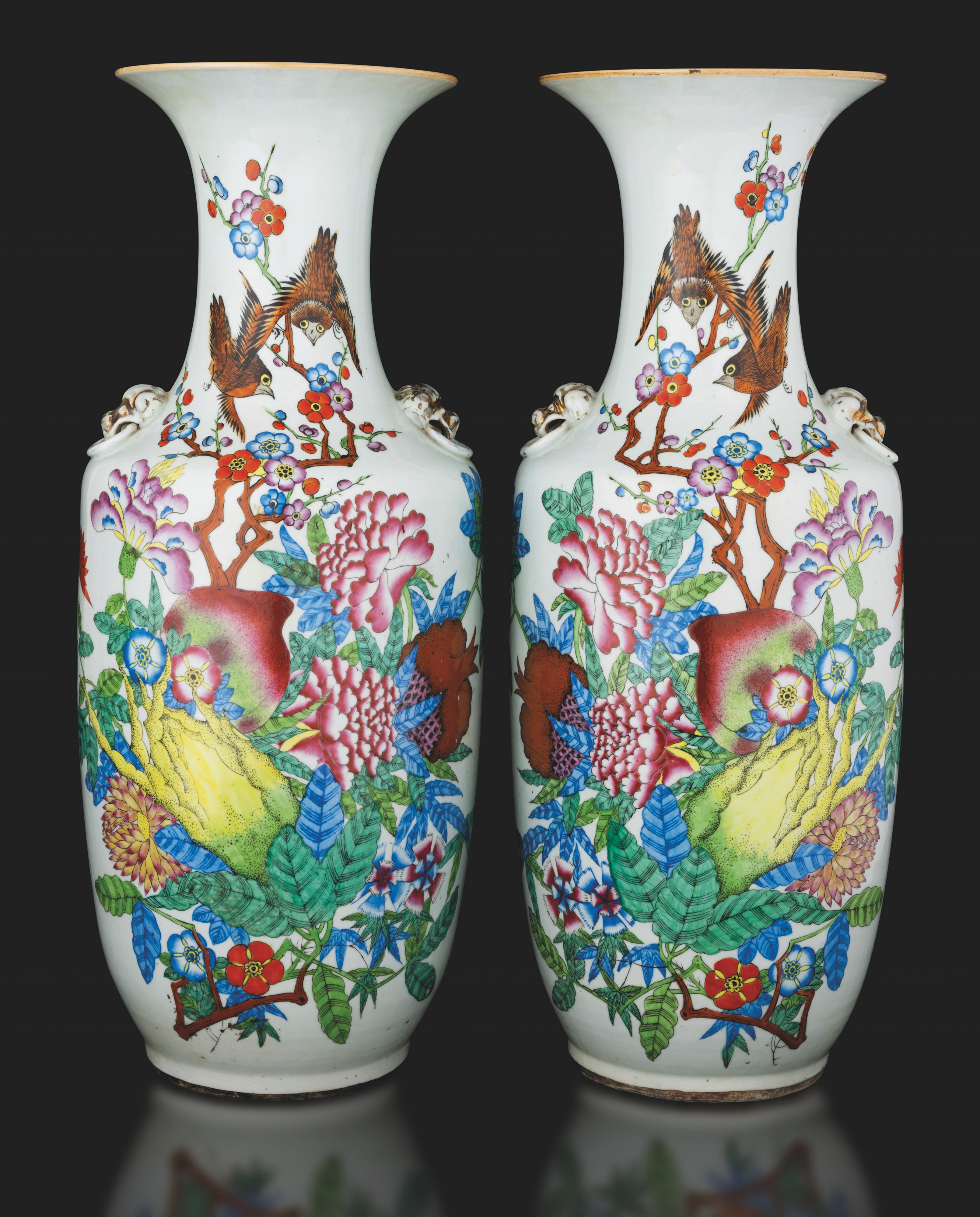 Coppia di vasi in porcellana raffiguranti paesaggio con uccelli, iscrizioni e mascheroni a foggia leonina, Cina, periodo [..]