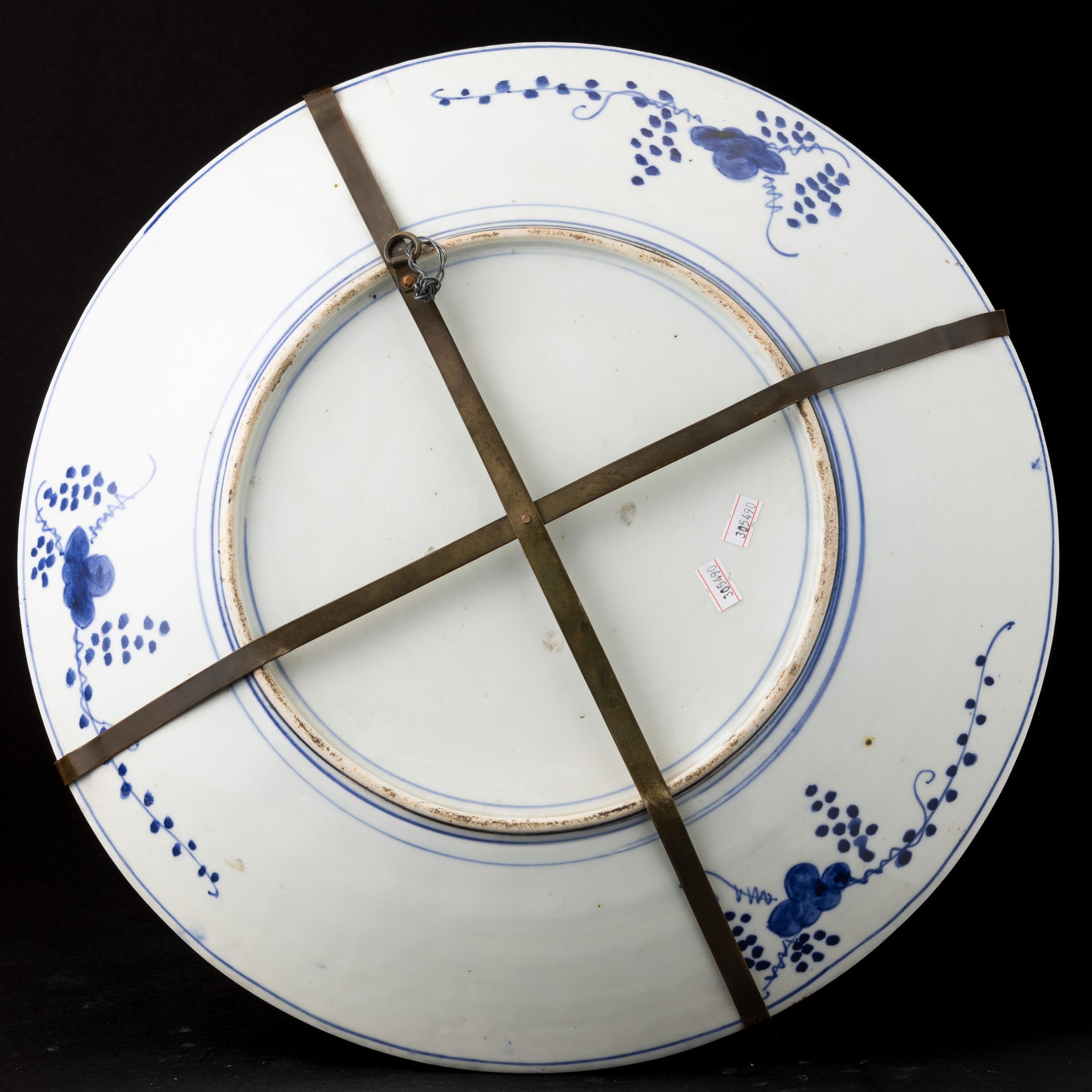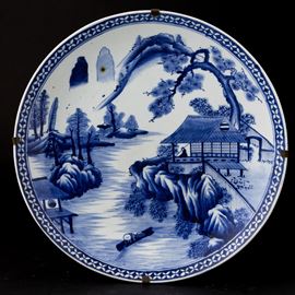 Grande piatto in porcellana bianca e blu raffigurante paesaggio montano, Giappone, XIX secolo