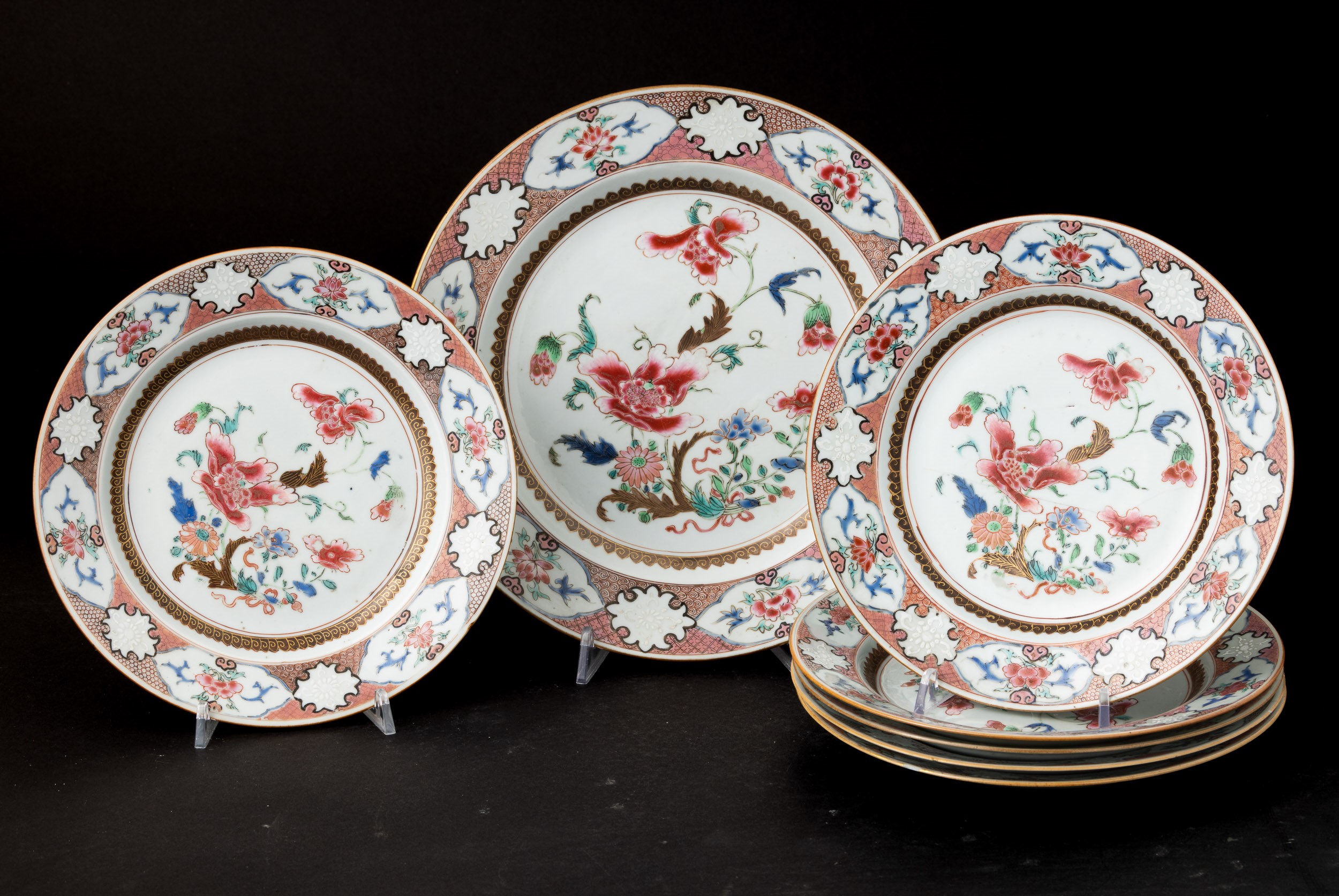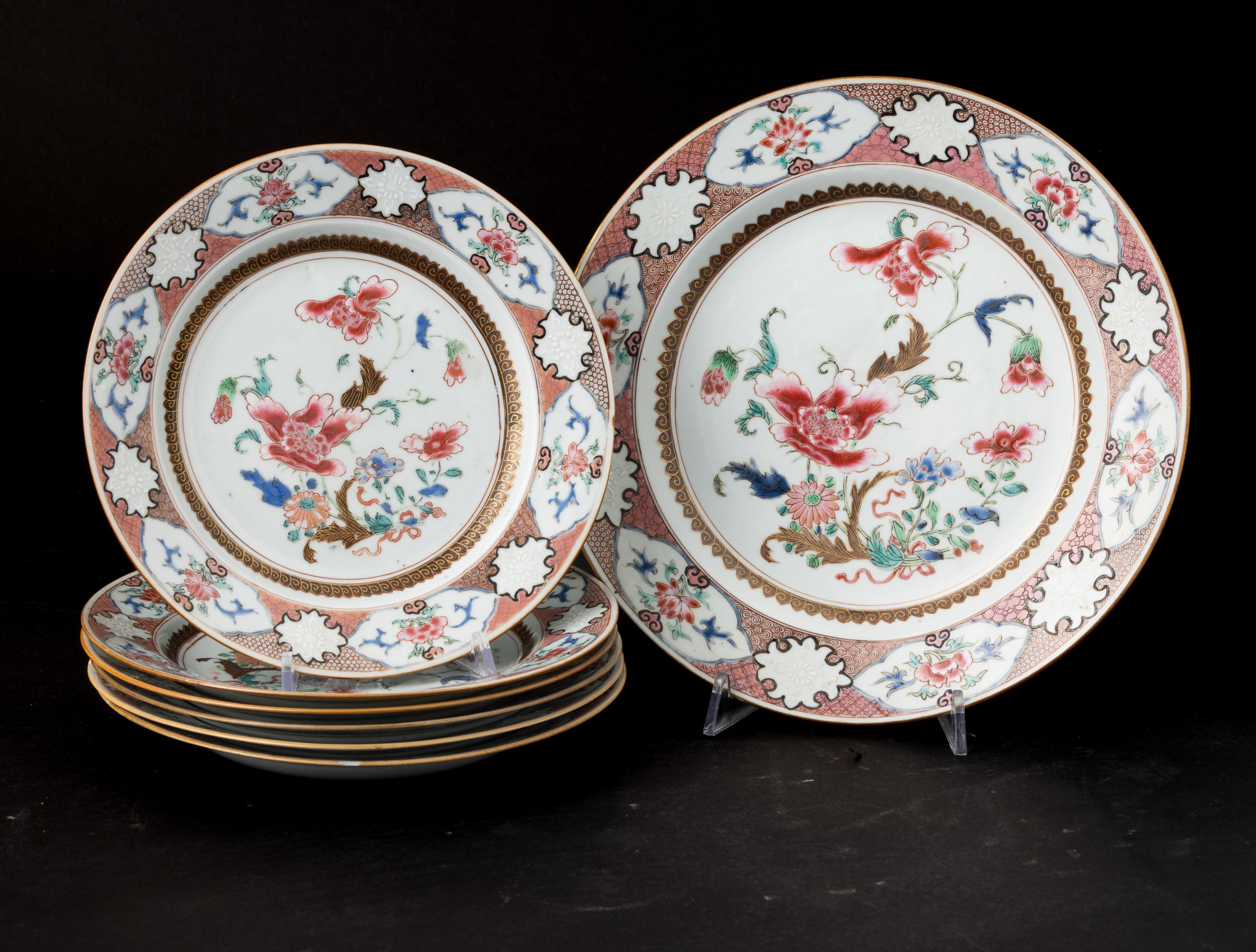 Lotto composto di sette piatti Famiglia Rosa a decoro floreale, Cina, Dinastia Qing, XVIII secolo