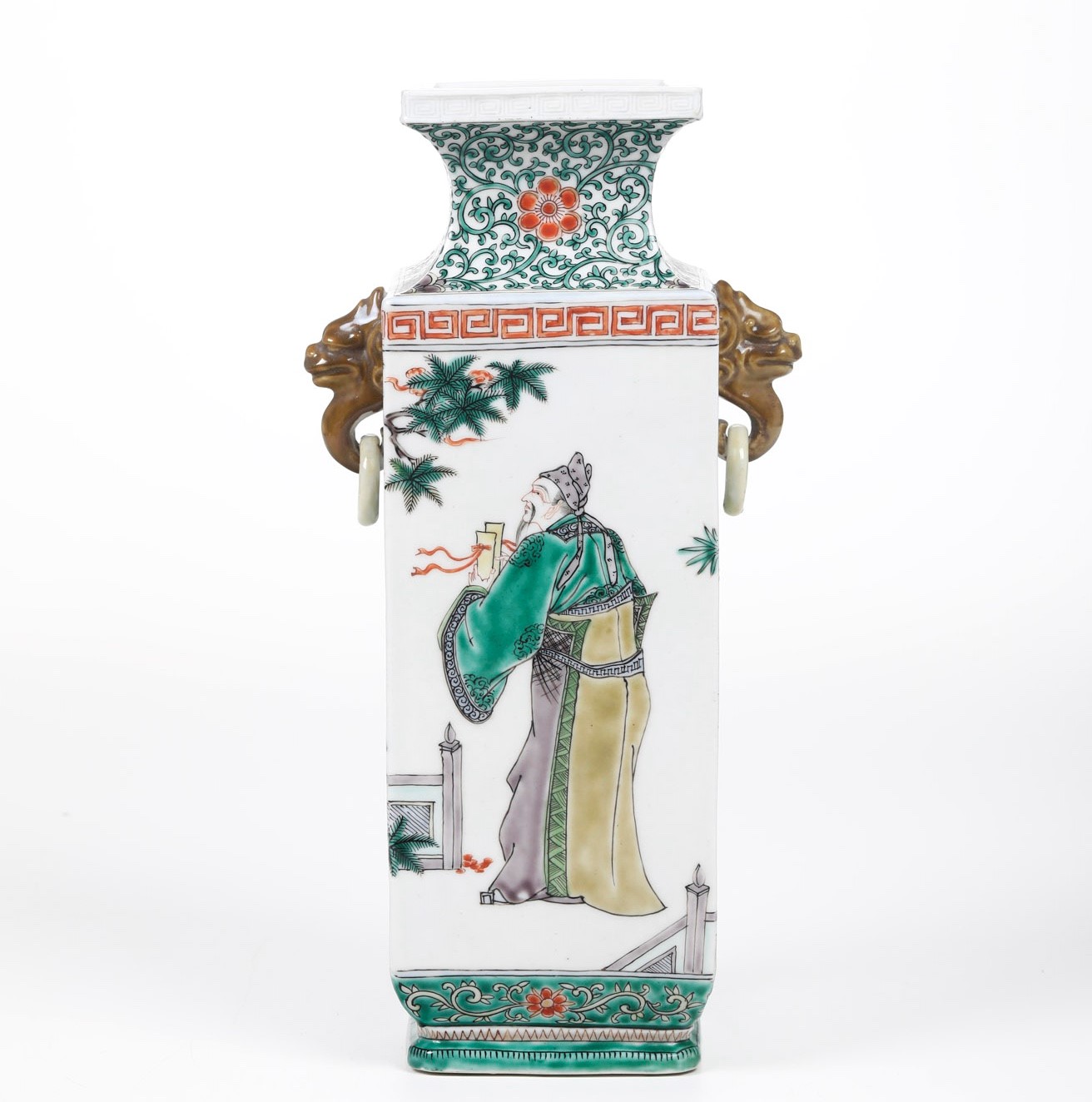 Vaso in porcellana Famiglia Verde con figure di saggi entro paesaggio, anse ad anello e mascheroni, Cina, Dinastia Qing, XIX secolo