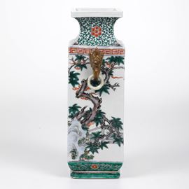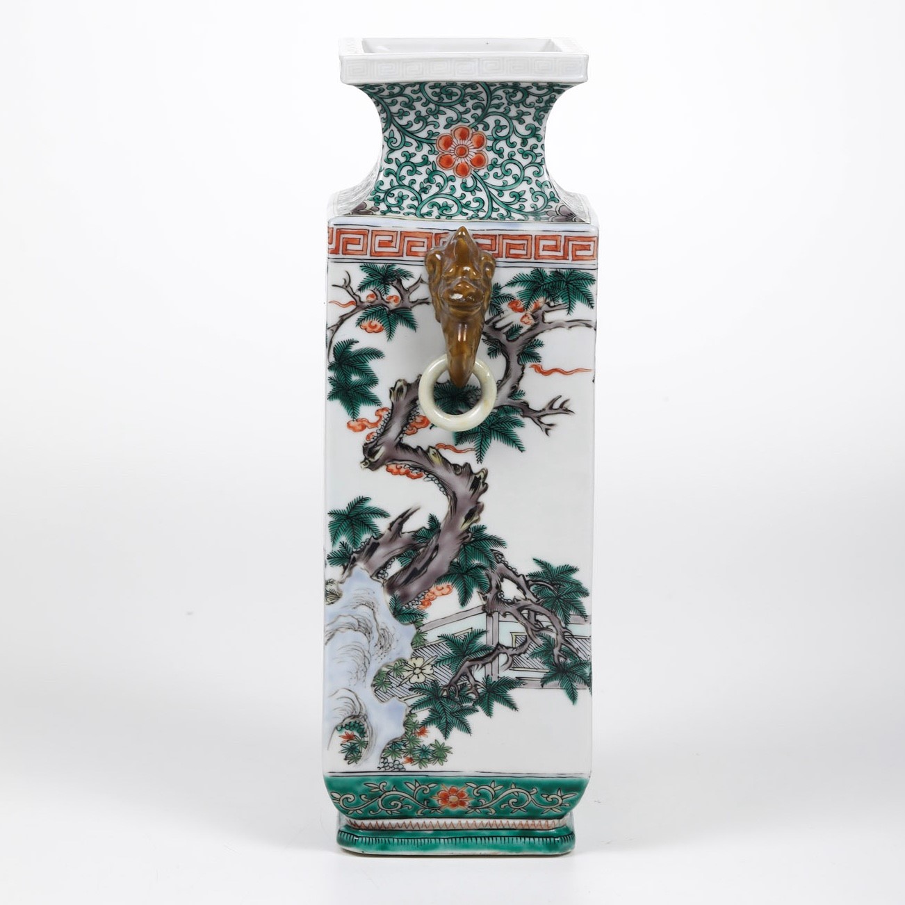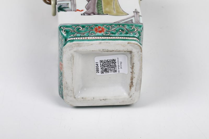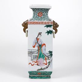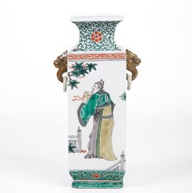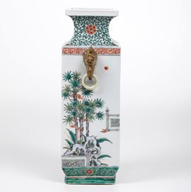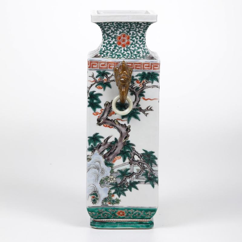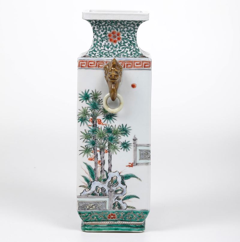 Vaso in porcellana Famiglia Verde con figure di saggi entro paesaggio, anse ad anello e mascheroni, Cina, Dinastia Qing, [..]