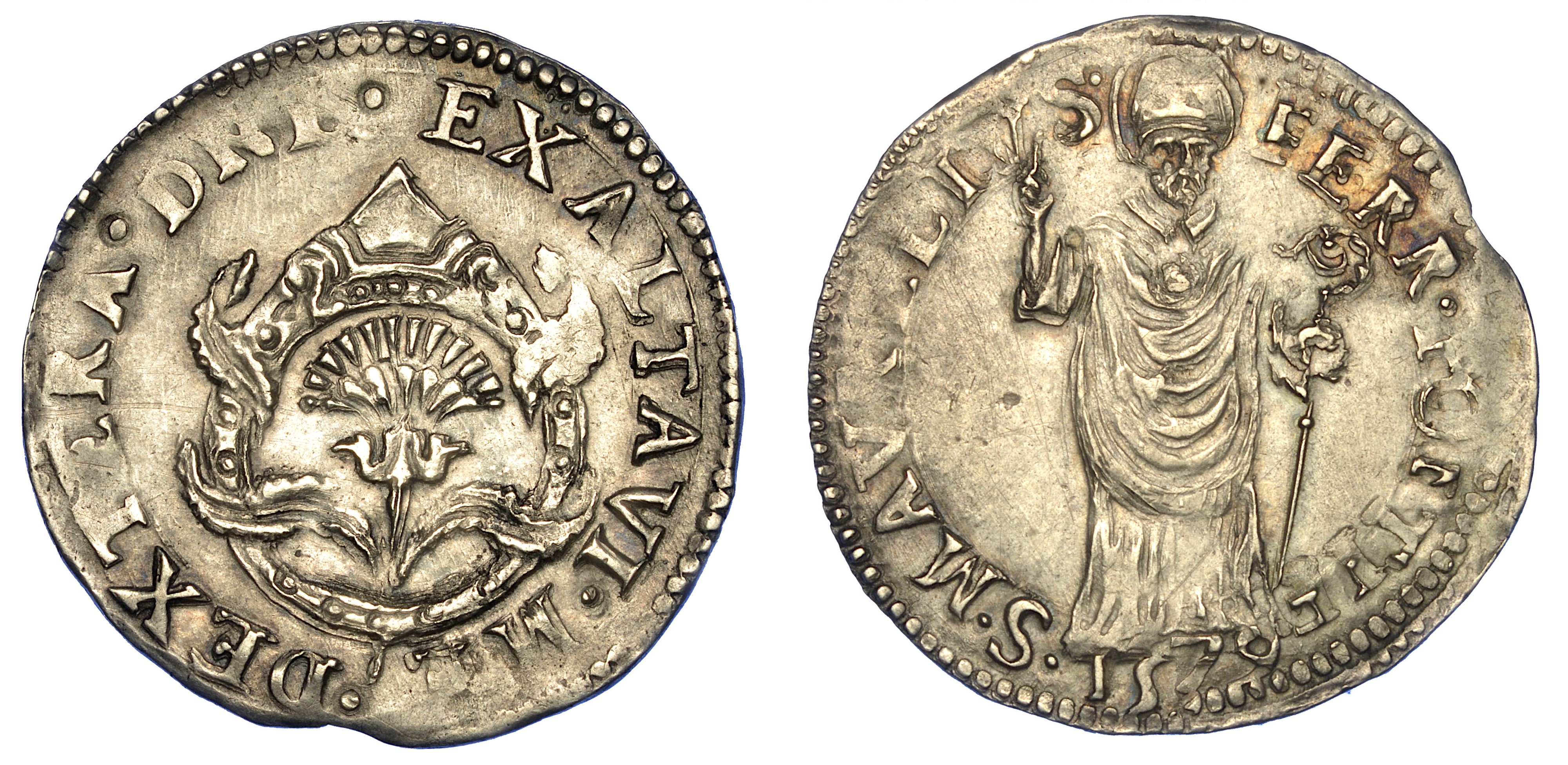 L'impresa del diamante. R/ San Maurilio stante di fronte benedice con la mano d. e tiene il pastorale con la s. CNI 12var. MIR 319/4. Raro. g. 2,03. Diam. mm. 23,04. Arg. q.SPL
