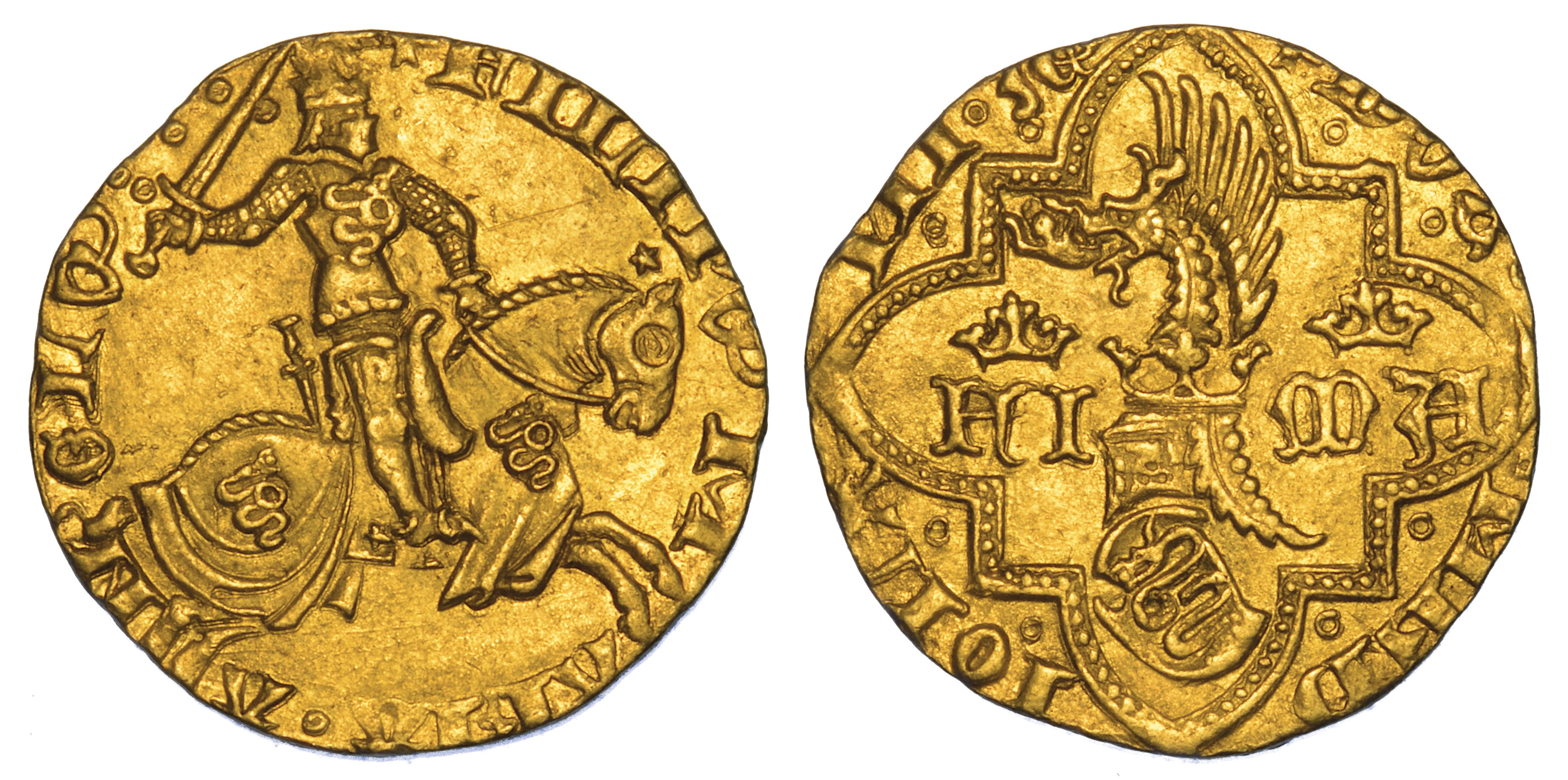 Il duca in armatura a cavallo al galoppo a d. Sulla corazza e sulla gualdrappa, piccole bisce. Sopra la testa del cavallo, piccola stella. R/ Scudetto con la biscia viscontea, sormontato da elmo con cimiero ornato da drago piumato con fanciullo nelle fauci. Ai lati, le lettere FI – MA sormontate da corona ducale; intorno, cornice con piccoli anelli negli angoli. Crippa 1/C. g. 3,51. Diam. mm. 20,41. Oro. SPL/FDC