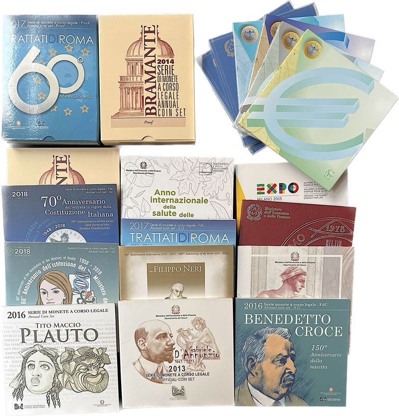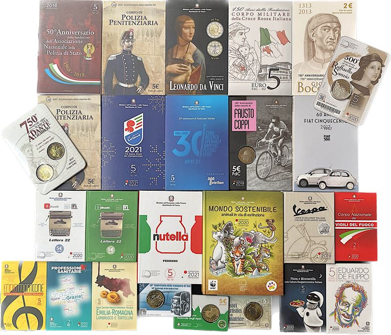 Serie commemorative in argento della Repubblica Italiana del periodo 2005-2021 (non completa). Si aggiungono commemorative da 2€ e 5€ bimetalliche o in metallo vile; serie divisionali del periodo 2002-2020 (non completa, alcune doppie). Notate: serie divisionali proof 2014 e 2017; serie commemorativa 2019 Allunaggio (2 esemplari). Interessantissimo lotto, da visionare.