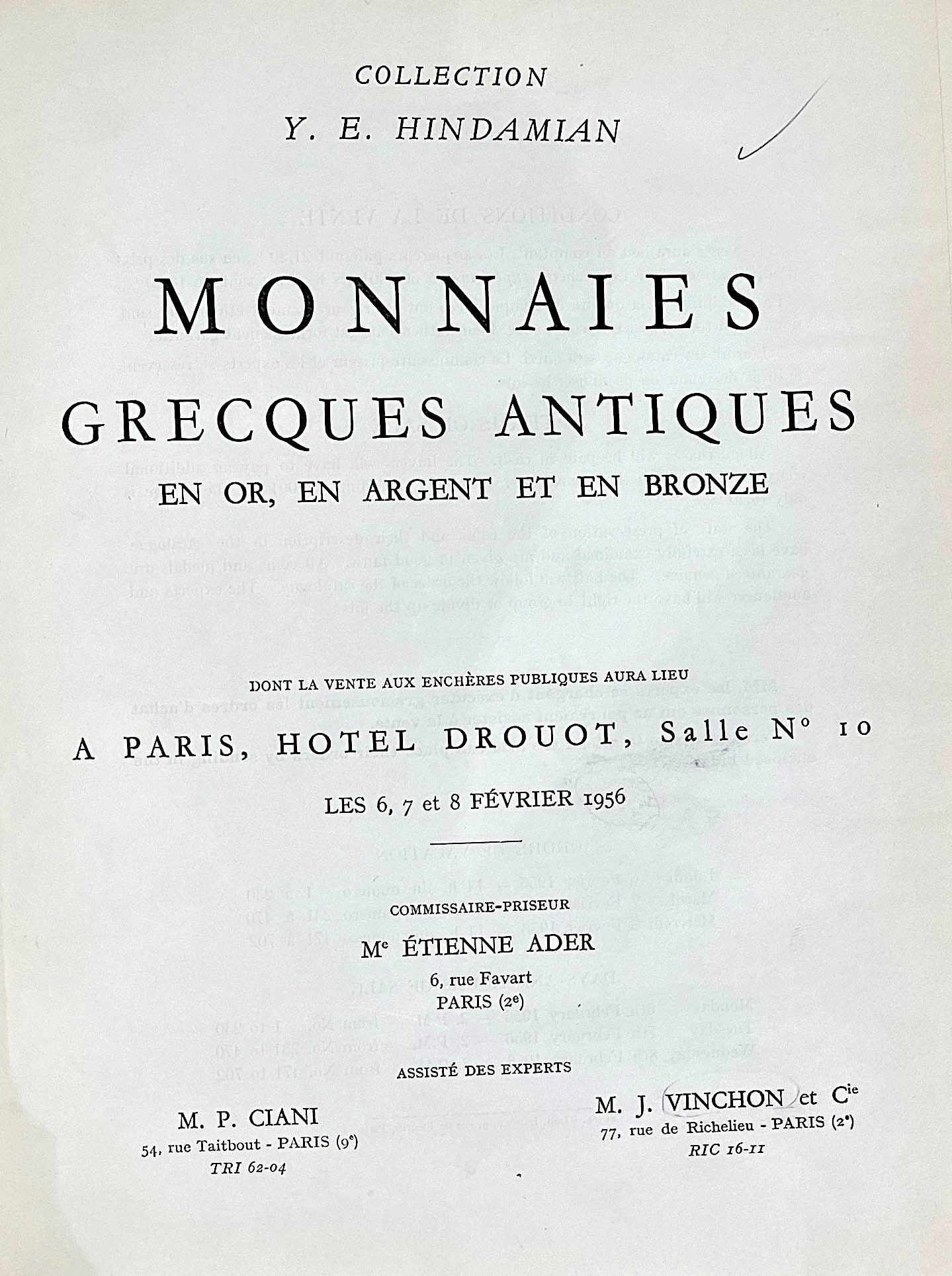 VINCHON J. Collections Y.E. HINDAMIAN. Monnaies Grecques Antiques.