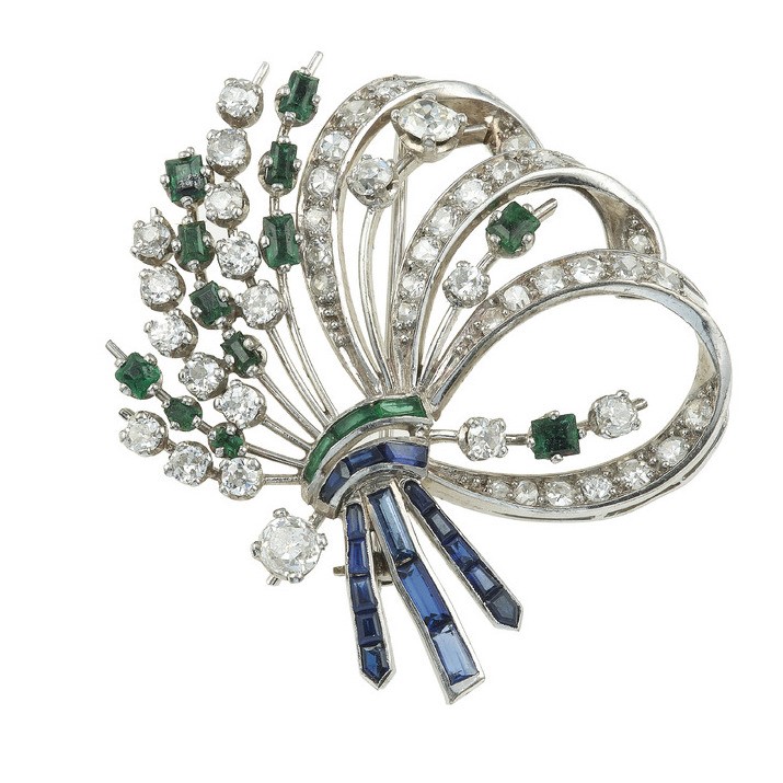 Spilla con diamanti di vecchio taglio, smeraldi e zaffiri