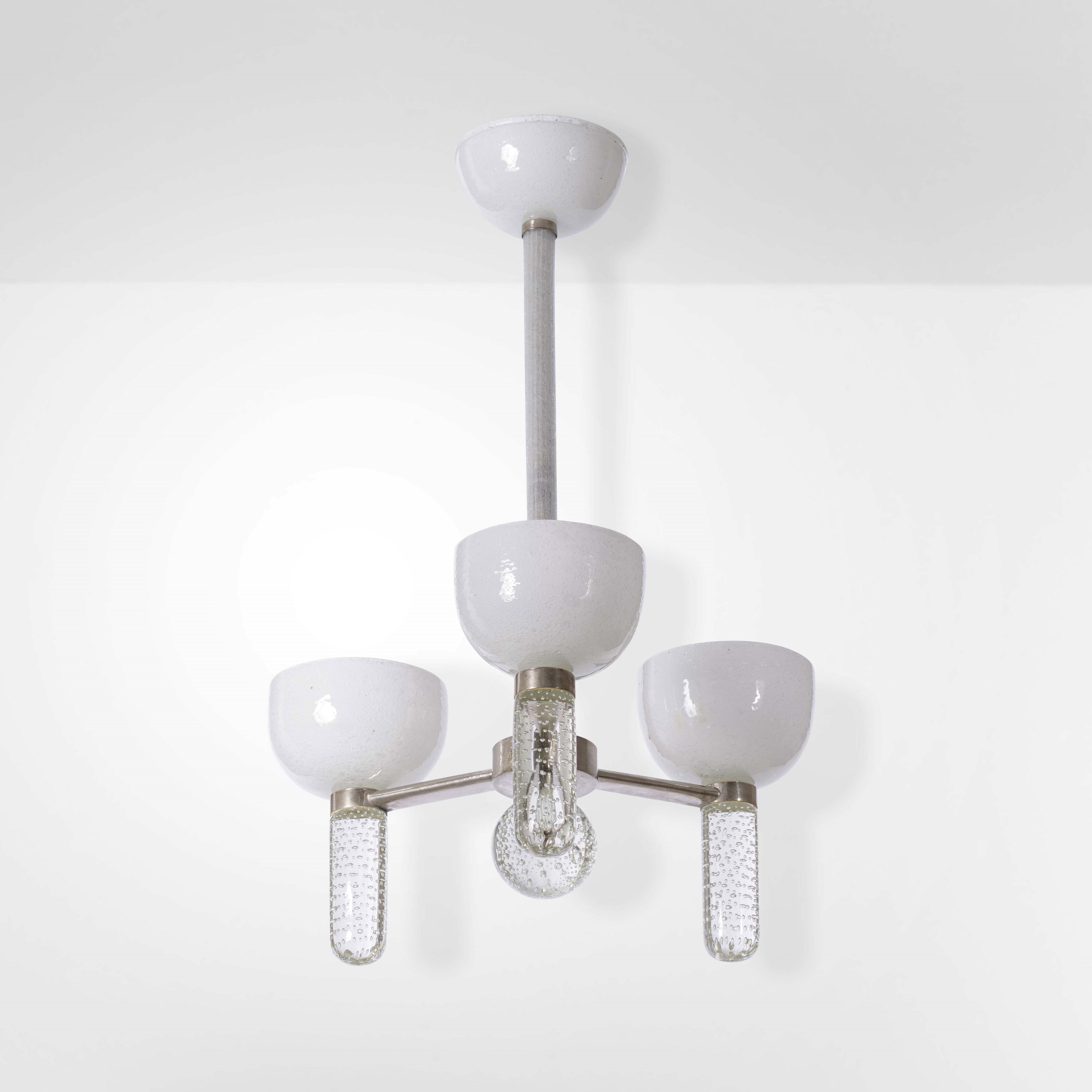 Struttura in metallo nichelato e diffusori in vetro di Murano pulegoso bianco