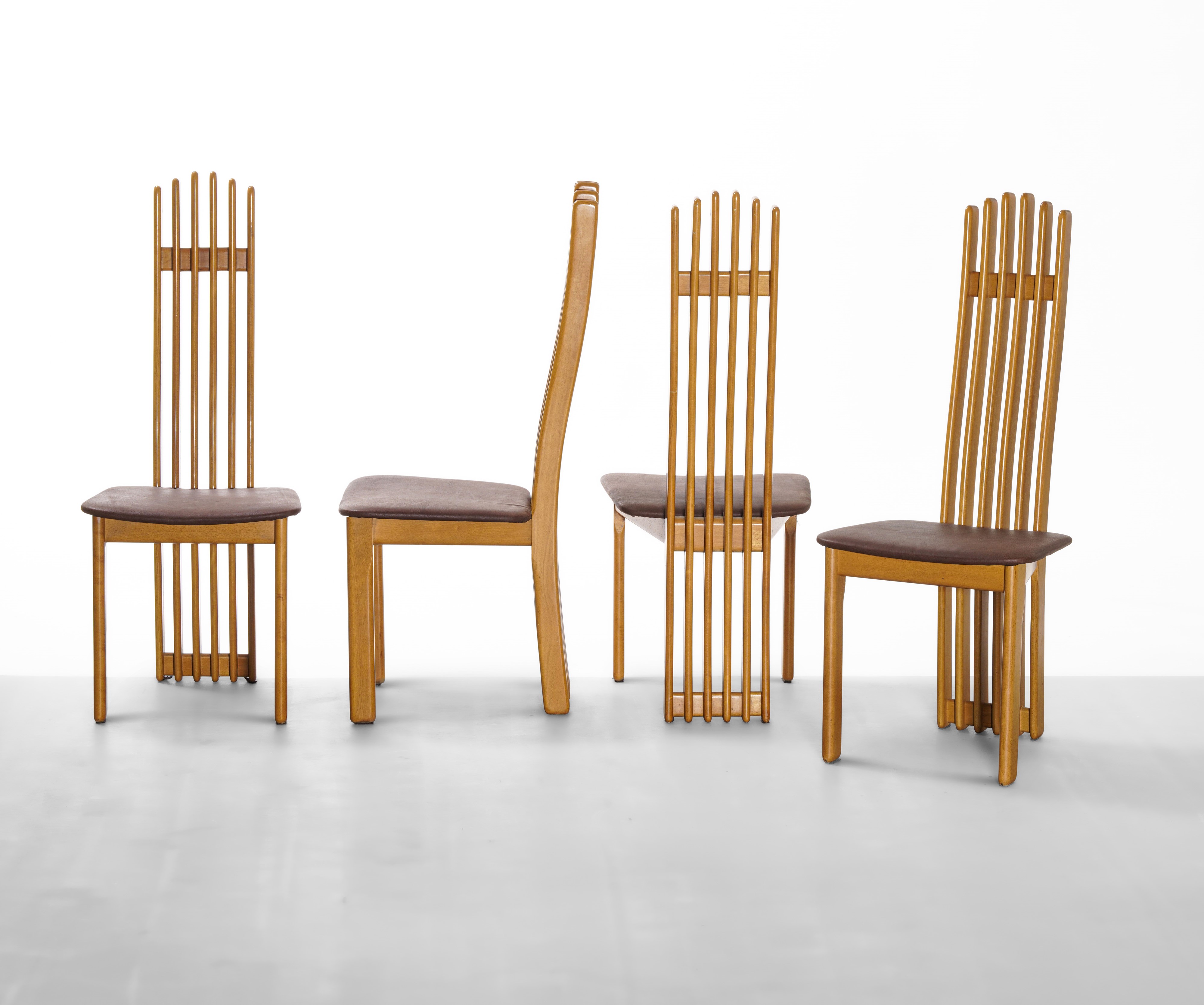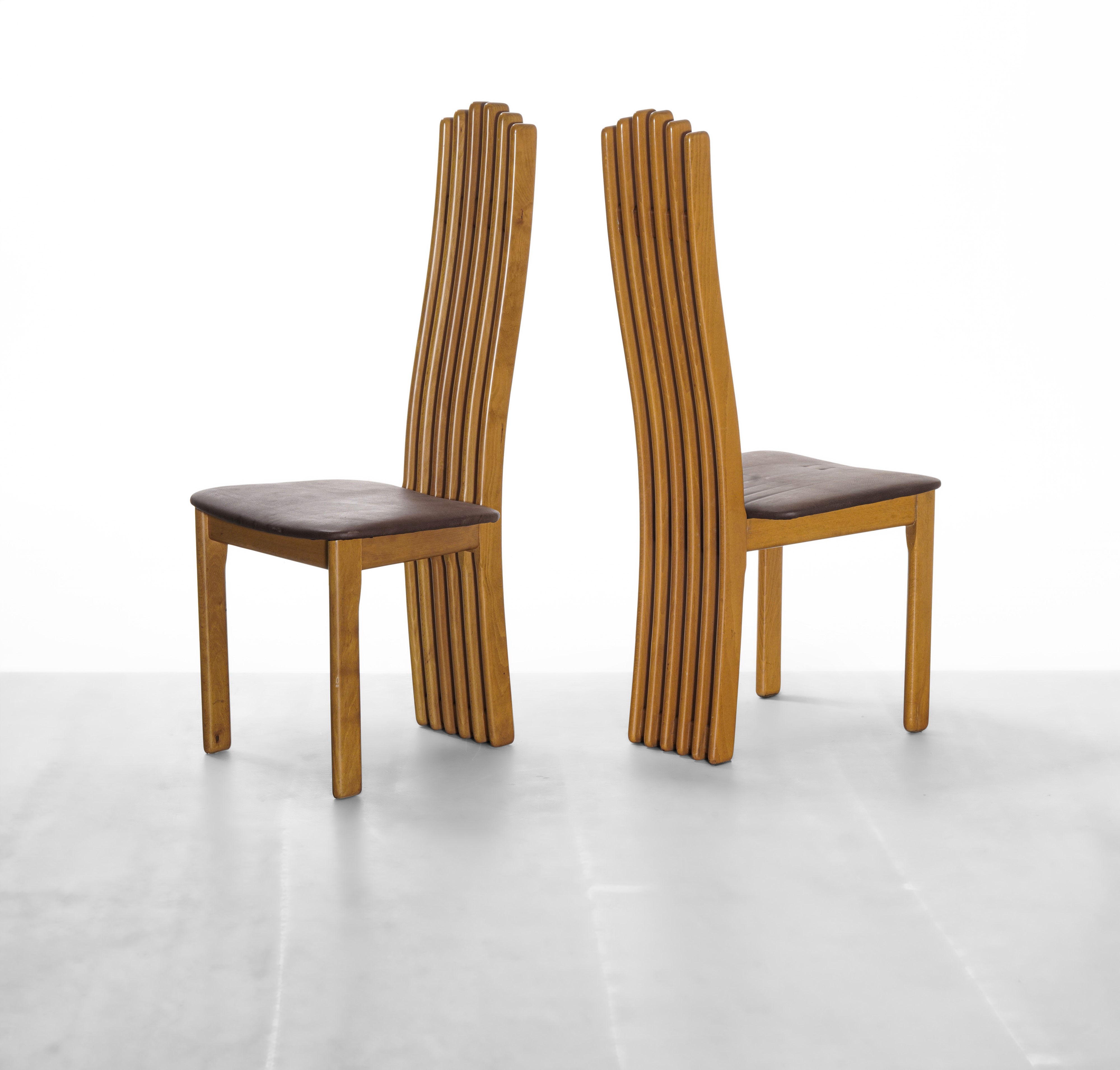 Struttura in legno, schienale a listelli e seduta con rivestimenti in pelle.