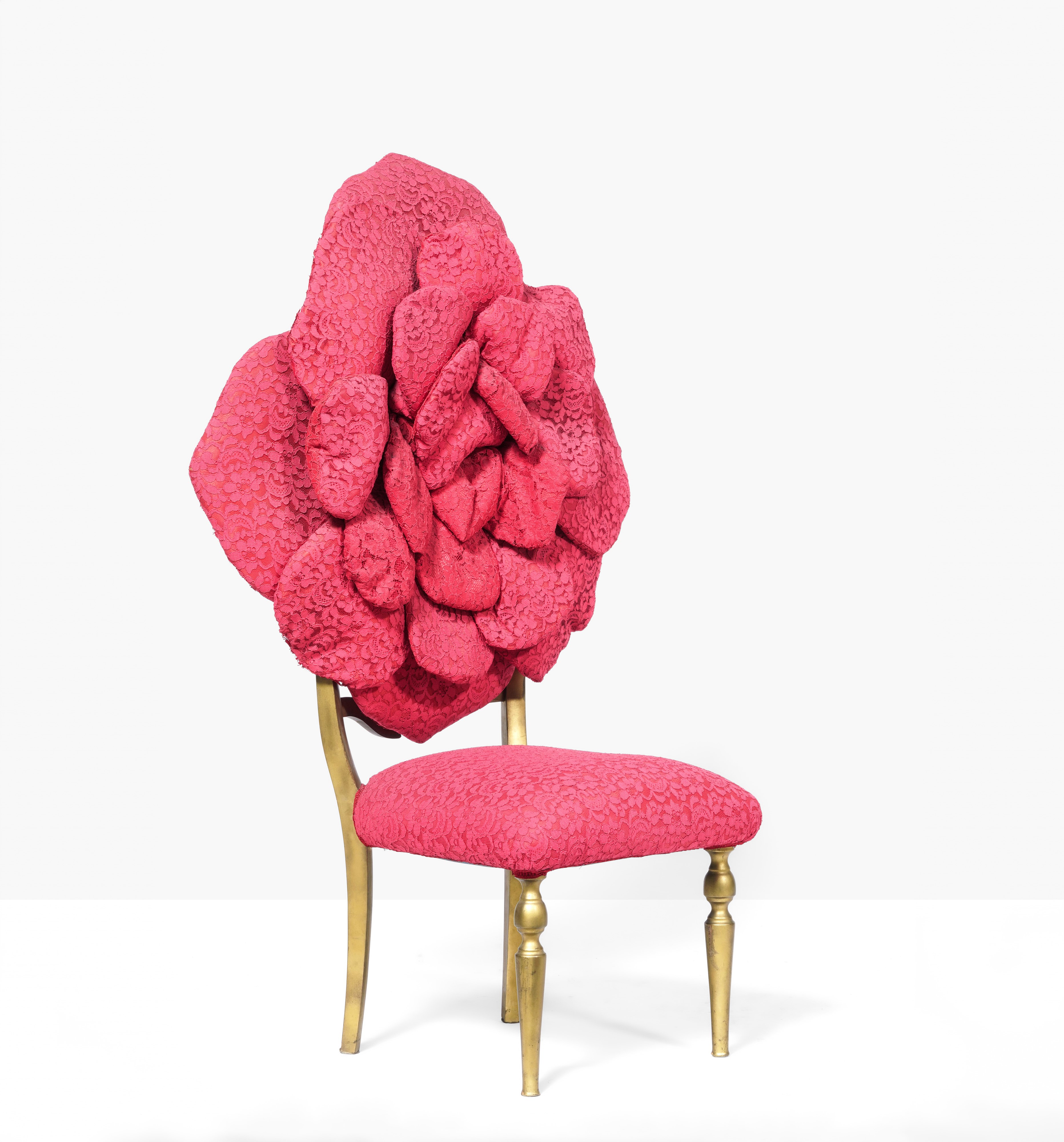 Struttura in legno laccato rivestita in pizzo rosso e tessuto. Pezzo unico.