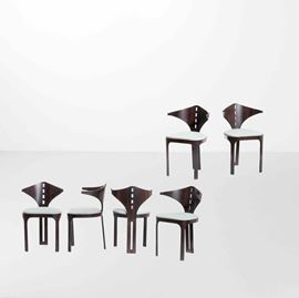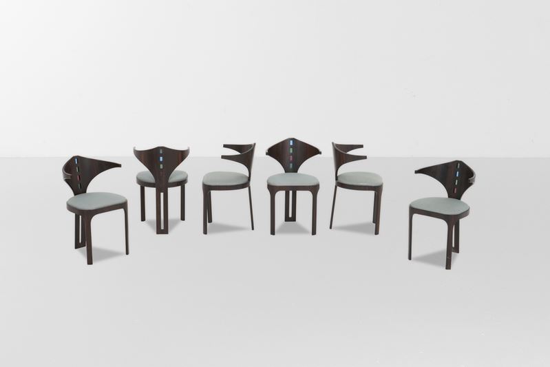 Struttura in legno ebanizzato con inserti in vetro colorato e rivestimenti in tessuto.