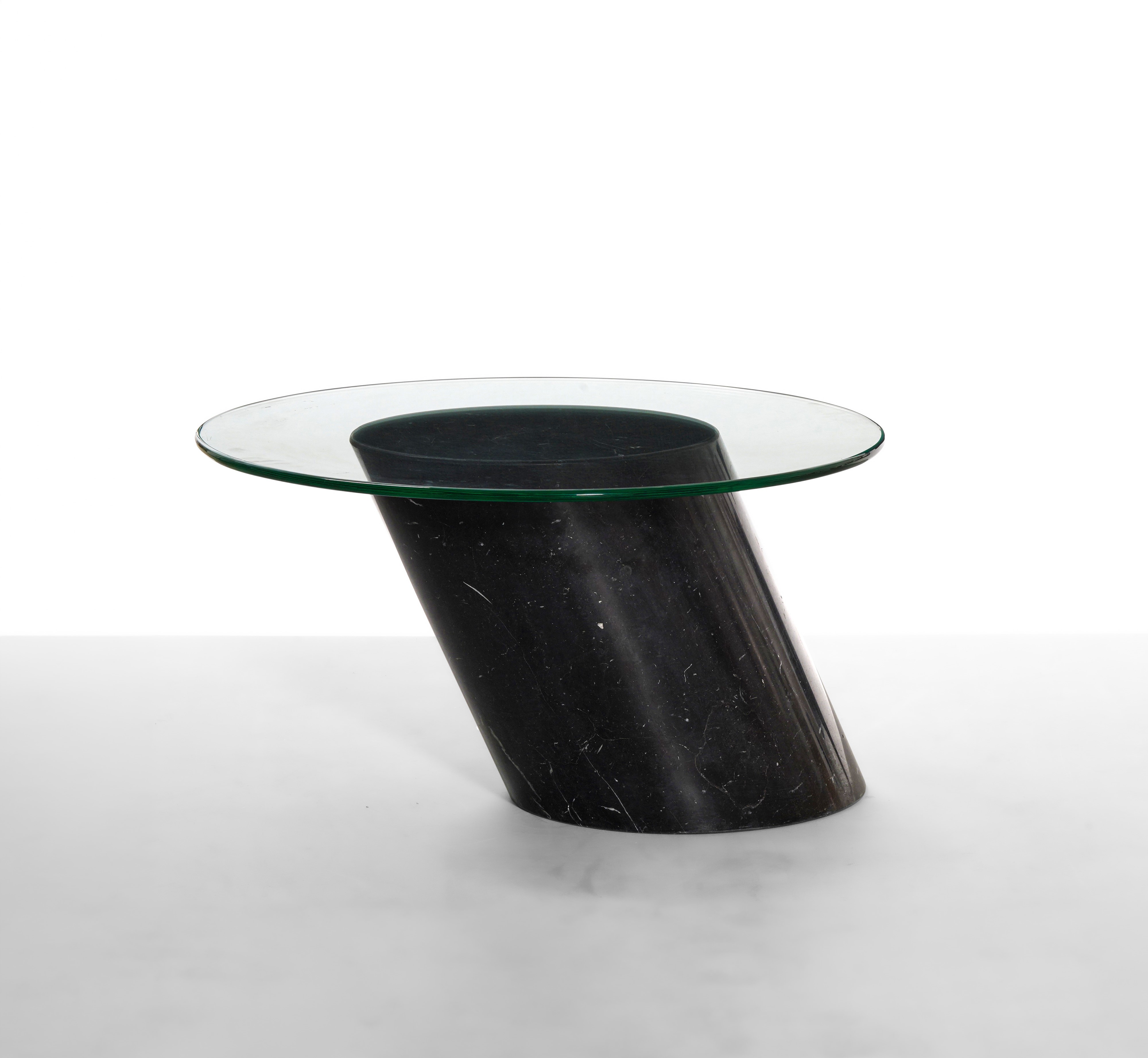 Struttura con sostegno in marmo nero e piano in vetro.